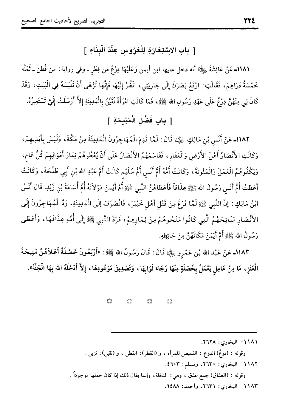1182 - عَنْ أَنَسِ بْنِ مَالِكٍ - رضي الله عنه - قَالَ: لَمَّا قَدِمَ الْمُهَاجِرُونَ الْمَدِينَةَ مِنْ مَكَّةَ وَلَيْسَ بِأَيْدِيهِمْ -يَعْنِي شَيْئًا- وَكَانَتِ الأَنْصَارُ أَهْلَ الأَرْضِ وَالْعَقَارِ فَقَاسَمَهُمُ الأَنْصَارُ عَلَى أَنْ يُعْطُوهُمْ ثِمَارَ أَمْوَالِهِمْ كُلَّ عَامٍ وَيَكْفُوهُمُ الْعَمَلَ وَالْمَئُونَةَ، وَكَانَتْ أُمُّهُ أُمُّ أَنَسٍ أُمُّ سُلَيْمٍ كَانَتْ أُمَّ عَبْدِ اللَّهِ بْنِ أَبِي طَلْحَةَ، فَكَانَتْ أَعْطَتْ أُمُّ أَنَسٍ رَسُولَ اللَّهِ - صلى الله عليه وسلم - عِذَاقًا فَأَعْطَاهُنَّ النَّبِيُّ - صلى الله عليه وسلم - أُمَّ أَيْمَنَ مَوْلاتَهُ أُمَّ أُسَامَةَ بْنِ زَيْدٍ، قَالَ أَنَسُ بْنُ مَالِكٍ: لَمَّا فَرَغَ النَّبِيَّ - صلى الله عليه وسلم - مِنْ قَتْلِ أَهْلِ خَيْبَرَ فَانْصَرَفَ إِلَى الْمَدِينَةِ رَدَّ الْمُهَاجِرُونَ إِلَى الأَنْصَارِ مَنَائِحَهُمِ الَّتِي كَانُوا مَنَحُوهُمْ مِنْ ثِمَارِهِمْ فَرَدَّ النَّبِيُّ - صلى الله عليه وسلم - إِلَى أُمِّهِ عِذَاقَهَا وَأَعْطَى رَسُولُ اللَّه - صلى الله عليه وسلم - أُمَّ أَيْمَنَ مَكَانَهُنَّ مِنْ حَائِطِهِ. (بخاري: 2630)