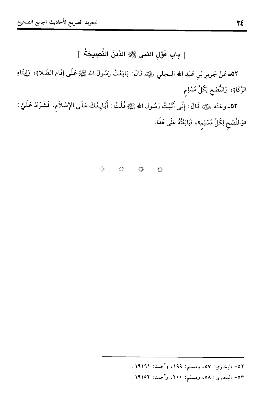 52 - عَنْ جَرِيرِ بْنِ عَبْدِ اللَّهِ - رضي الله عنه - قَالَ: بَايَعْتُ رَسُولَ اللَّهِ - صلى الله عليه وسلم - عَلَى إِقَامِ الصَّلاةِ وَإِيتَاءِ الزَّكَاةِ وَالنُّصْحِ لِكُلِّ مُسْلِمٍ. (بخاري: 57)