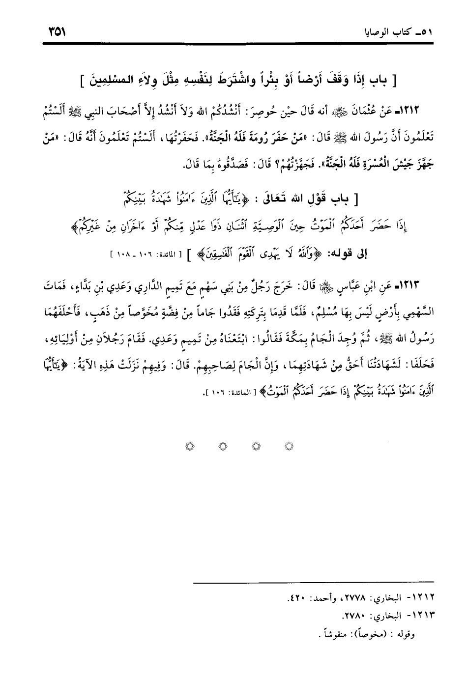 1213 - عَنِ ابْنِ عَبَّاسٍ - رضي الله عنهما - قَالَ: خَرَجَ رَجُلٌ مِنْ بَنِي سَهْمٍ مَعَ تَمِيمٍ الدَّارِيِّ وَعَدِيِّ بْنِ بَدَّاءٍ، فَمَاتَ السَّهْمِيُّ بِأَرْضٍ لَيْسَ بِهَا مُسْلِمٌ، فَلَمَّا قَدِمَا بِتَرِكَتِهِ فَقَدُوا جَامًا مِنْ فِضَّةٍ مُخَوَّصًا مِنْ ذَهَبٍ فَأَحْلَفَهُمَا رَسُولُ اللَّهِ - صلى الله عليه وسلم -، ثُمَّ وُجِدَ الْجَامُ بِمَكَّةَ فَقَالُوا: ابْتَعْنَاهُ مِنْ تَمِيمٍ وَعَدِيٍّ فَقَامَ رَجُلانِ مِنْ أَوْلِيَائِهِ فَحَلَفَا لَشَهَادَتُنَا أَحَقُّ مِنْ شَهَادَتِهِمَا وَإِنَّ الْجَامَ لِصَاحِبِهِمْ، قَالَ: وَفِيهِمْ نَزَلَتْ هَذِهِ الآيَةُ: {يَاأَيُّهَا الَّذِينَ آمَنُوا شَهَادَةُ بَيْنِكُمْ إِذَا حَضَرَ أَحَدَكُمُ الْمَوْتُ}. (بخاري: 2780)