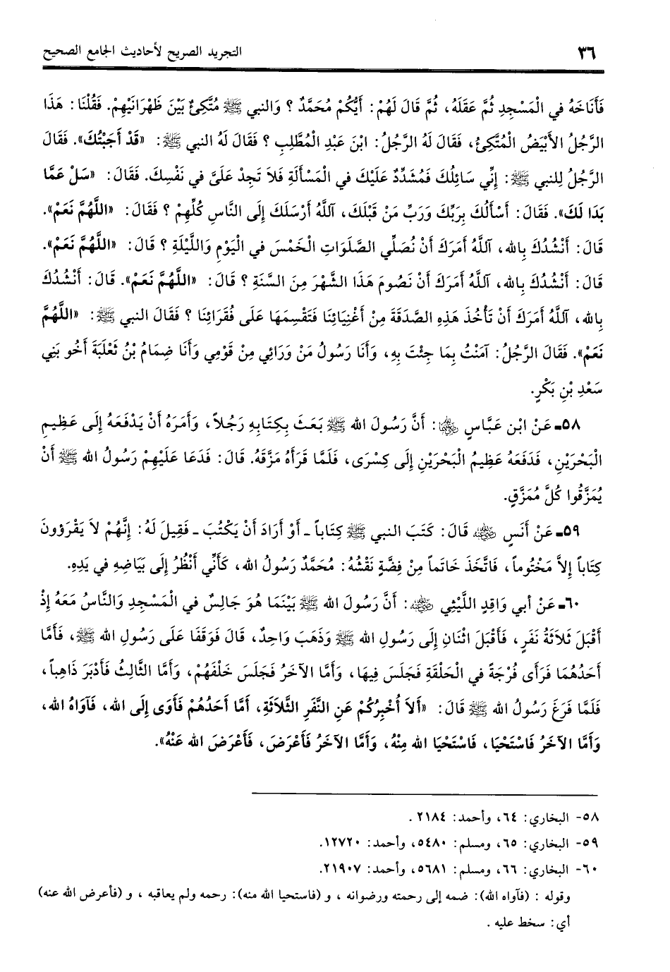 58 - عَن ابْنِ عَبَّاسٍ - رضي الله عنهما -: أَنَّ رَسُولَ اللَّهِ - صلى الله عليه وسلم - بَعَثَ بِكِتَابِهِ رَجُلًا وَأَمَرَهُ أَنْ يَدْفَعَهُ إِلَى عَظِيمِ الْبَحْرَيْنِ، فَدَفَعَهُ عَظِيمُ الْبَحْرَيْنِ إِلَى كِسْرَى فَلَمَّا قَرَأَهُ مَزَّقَهُ، قَالَ: فَدَعَا عَلَيْهِمْ رَسُولُ اللَّهِ - صلى الله عليه وسلم - أَنْ يُمَزَّقُوا كُلَّ مُمَزَّقٍ. (بخاري: 64)