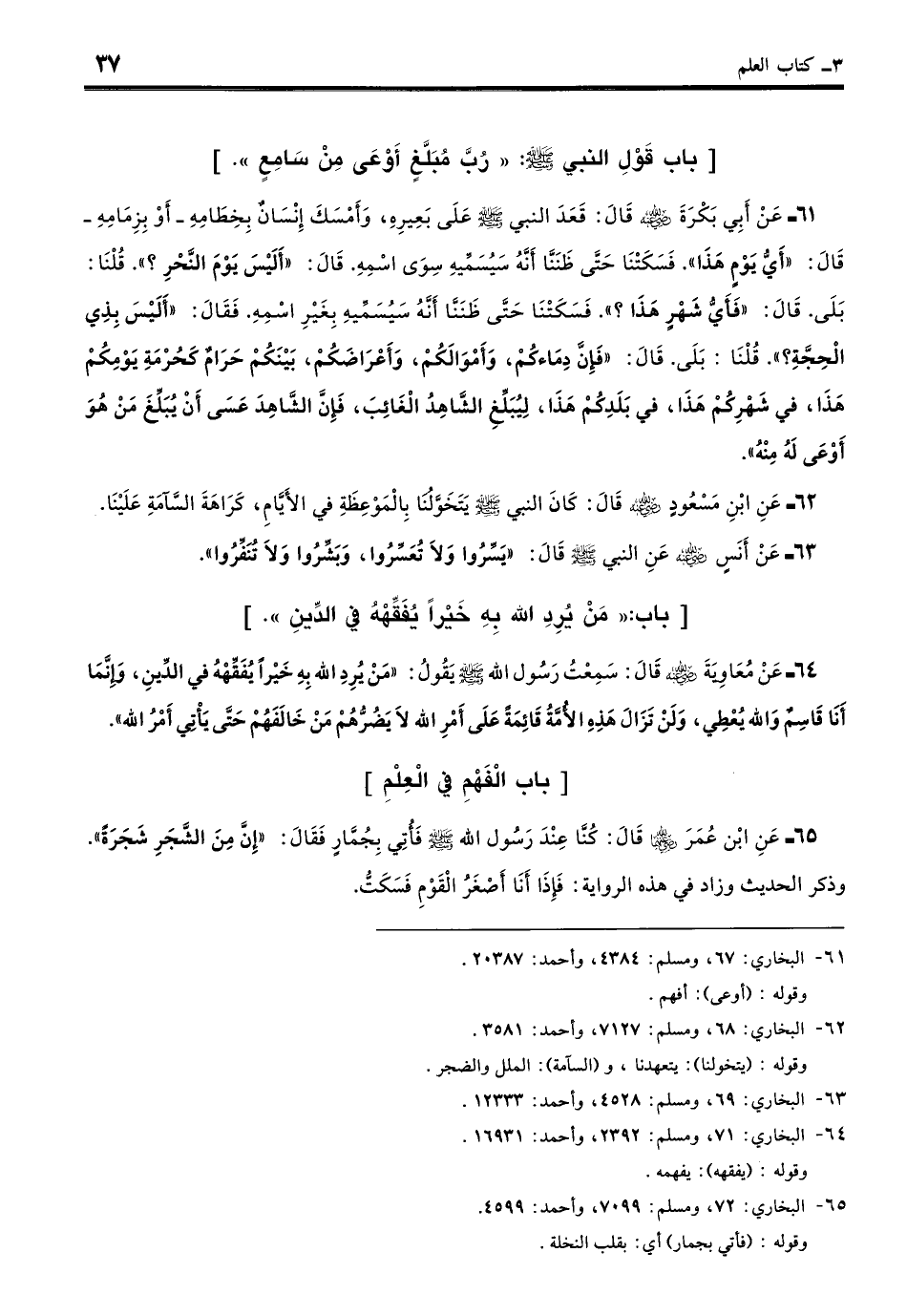 61 - عْن أَبِي بَكْرَةَ - رضي الله عنه - قال: قَعَدَ النَّبِيَّ - صلى الله عليه وسلم - عَلَى بَعِيرِهِ وَأَمْسَكَ إِنْسَانٌ بِخِطَامِهِ -أَوْ: بِزِمَامِهِ- قَالَ: «أَيُّ يَوْمٍ هَذَا»؟ فَسَكَتْنَا حَتَّى ظَنَنَّا أَنَّهُ سَيُسَمِّيهِ سِوَى اسْمِهِ. قَالَ: «أَلَيْسَ يَوْمَ النَّحْرِ»؟ قُلْنَا بَلَى. قَالَ: «فَأَيُّ شَهْرٍ هَذَا»؟ فَسَكَتْنَا حَتَّى ظَنَنَّا أَنَّهُ سَيُسَمِّيهِ بِغَيْرِ اسْمِهِ. فَقَالَ: «أَلَيْسَ بِذِي الْحِجَّةِ»؟ قُلْنَا: «بَلَى». قَالَ: «فَإِنَّ دِمَاءَكُمْ وَأَمْوَالَكُمْ وَأَعْرَاضَكُمْ بَيْنَكُمْ حَرَامٌ كَحُرْمَةِ يَوْمِكُمْ هَذَا فِي شَهْرِكُمْ هَذَا فِي بَلَدِكُمْ هَذَا، لِيُبَلِّغِ الشَّاهِدُ الْغَائِبَ، فَإِنَّ الشَّاهِدَ عَسَى أَنْ يُبَلِّغَ مَنْ هُوَ أَوْعَى لَهُ مِنْهُ». (بخاري: 67)