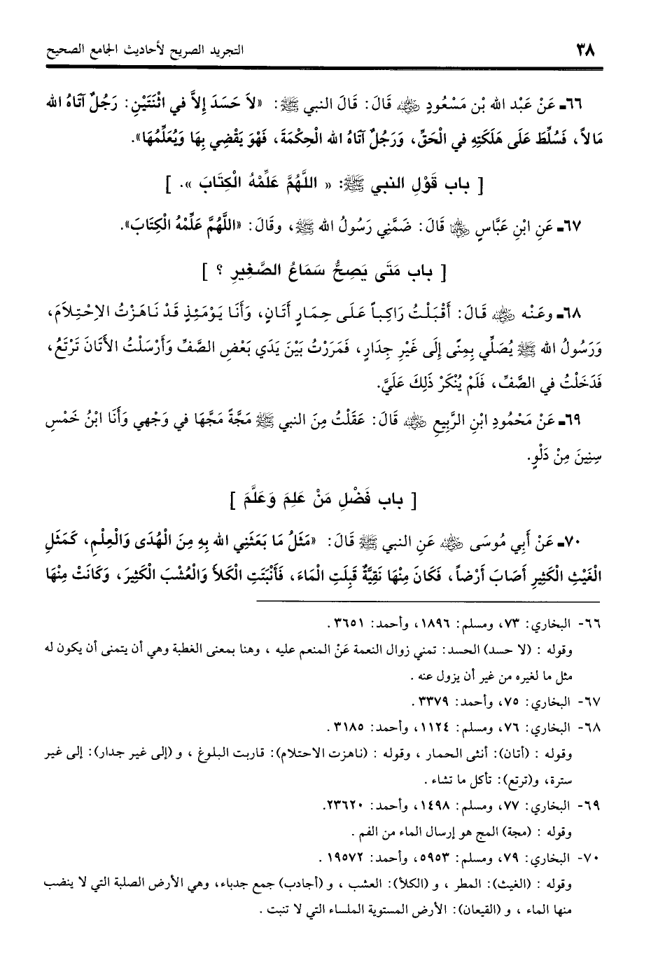 67 - عَنِ ابْنِ عَبَّاسٍ - رضي الله عنهما - قَالَ: ضَمَّنِي رَسُولُ اللَّهِ - صلى الله عليه وسلم - وَقَالَ: «اللَّهُمَّ عَلِّمْهُ الْكِتَابَ». (بخاري: 75)