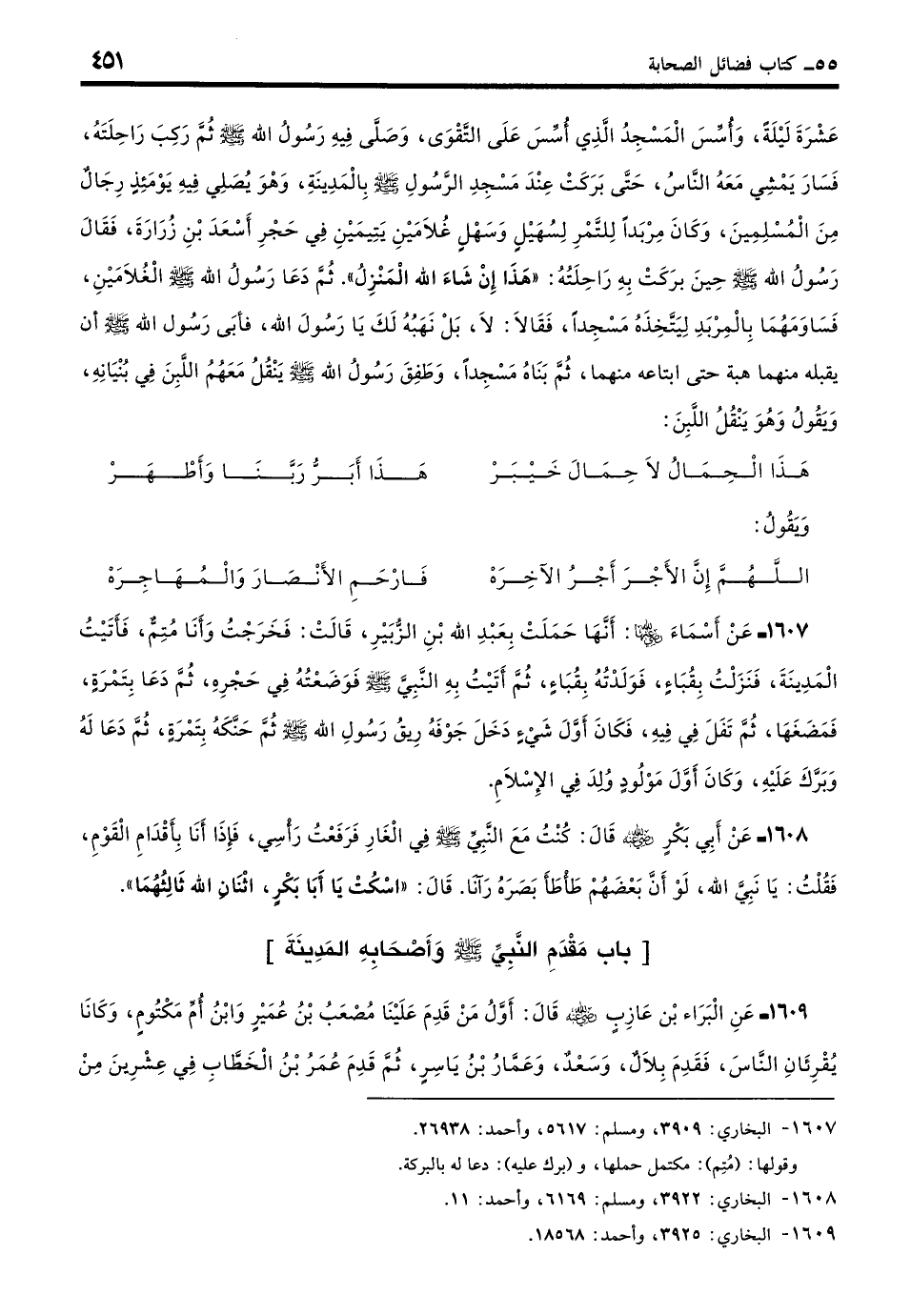 1607 - عَنْ أَسْمَاءَ - رضي الله عنها -: أَنَّهَا حَمَلَتْ بِعَبْدِ اللَّهِ بْنِ الزُّبَيْرِ، قَالَتْ: فَخَرَجْتُ وَأَنَا مُتِمٌّ، فَأَتَيْتُ الْمَدِينَةَ فَنَزَلْتُ بِقُبَاءٍ فَوَلَدْتُهُ بِقُبَاءٍ، ثُمَّ أَتَيْتُ بِهِ النَّبِيَّ - صلى الله عليه وسلم - فَوَضَعْتُهُ فِي حَجْرِهِ، ثُمَّ دَعَا بِتَمْرَةٍ فَمَضَغَهَا ثُمَّ تَفَلَ فِي فِيهِ، فَكَانَ أَوَّلَ شَيْءٍ دَخَلَ جَوْفَهُ رِيقُ رَسُولِ اللَّهِ - صلى الله عليه وسلم -، ثُمَّ حَنَّكَهُ بِتَمْرَةٍ ثُمَّ دَعَا لَهُ وَبَرَّكَ عَلَيْهِ، وَكَانَ أَوَّلَ مَوْلُودٍ وُلِدَ فِي الإِسْلامِ. (بخاري: 3909)