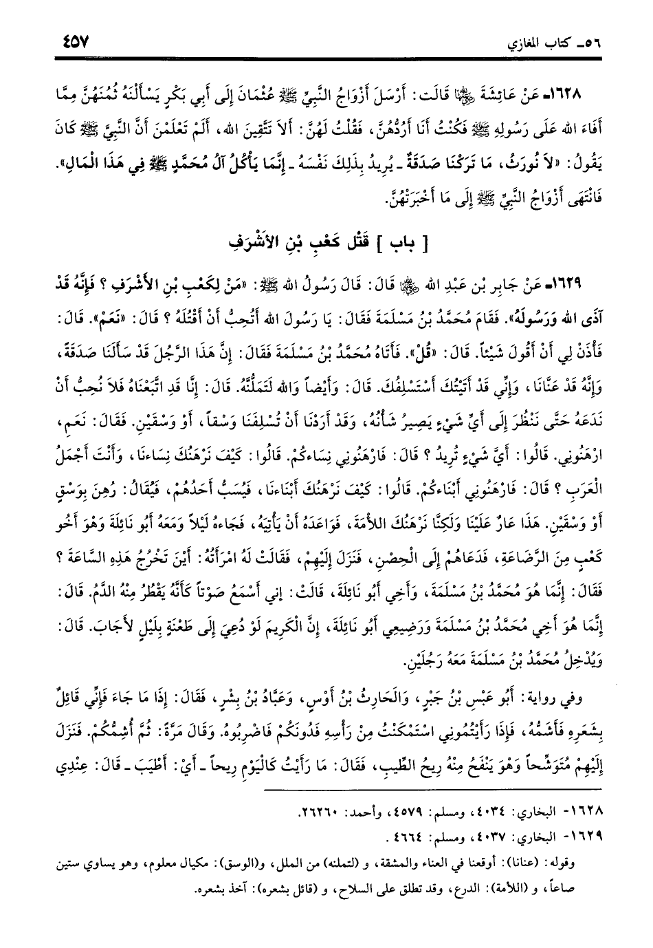 1629 - عَنْ جَابِرِ بْنِ عَبْدِ اللَّهِ - رضي الله عنهما - قَالَ: قَالَ رَسُولُ اللَّهِ - صلى الله عليه وسلم -: «مَنْ لِكَعْبِ بْنِ الأَشْرَفِ؟ فَإِنَّهُ قَدْ آذَى اللَّهَ وَرَسُولَهُ». فَقَامَ مُحَمَّدُ بْنُ مَسْلَمَةَ فَقَالَ: يَا رَسُولَ اللَّهِّ أَتُحِبُّ أَنْ أَقْتُلَهُ؟ قَالَ: نَعَمْ. قَالَ: فَأْذَنْ لِي أَنْ أَقُولَ شَيْئًا، قَالَ: «قُلْ». فَأَتَاهُ مُحَمَّدُ بْنُ مَسْلَمَةَ فَقَالَ: إِنَّ هَذَا الرَّجُلَ قَدْ سَأَلَنَا صَدَقَةً وَإِنَّهُ قَدْ عَنَّانَا وَإِنِّي قَدْ أَتَيْتُكَ أَسْتَسْلِفُكَ. قَالَ: وَأَيْضًا وَاللَّهِ لَتَمَلُّنَّهُ. قَالَ: إِنَّا قَدِ اتَّبَعْنَاهُ فَلا نُحِبُّ أَنْ نَدَعَهُ حَتَّى نَنْظُرَ إِلَى أَيِّ شَيْءٍ يَصِيرُ شَأْنُهُ، وَقَدْ أَرَدْنَا أَنْ تُسْلِفَنَا وَسْقًا أَوْ وَسْقَيْنِ. فَقَالَ: نَعَمِ ارْهَنُونِي، قَالُوا: أَيَّ شَيْءٍ تُرِيدُ؟ قَالَ: ارْهَنُونِي نِسَاءَكُمْ. قَالُوا: كَيْفَ نَرْهَنُكَ نِسَاءَنَا وَأَنْتَ أَجْمَلُ الْعَرَبِ؟ قَالَ: فَارْهَنُونِي أَبْنَاءَكُمْ. قَالُوا: كَيْفَ نَرْهَنُكَ أَبْنَاءَنَا فَيُسَبُّ أَحَدُهُمْ فَيُقَالُ: رُهِنَ بِوَسْقٍ أَوْ وَسْقَيْنِ؟ هَذَا عَارٌ عَلَيْنَا، وَلَكِنَّا نَرْهَنُكَ اللأْمَةَ، فَوَاعَدَهُ أَنْ يَأْتِيَهُ فَجَاءَهُ لَيْلًا وَمَعَهُ أَبُو نَائِلَةَ، وَهُوَ أَخُو كَعْبٍ مِنَ الرَّضَاعَةِ، فَدَعَاهُمْ إِلَى الْحِصْنِ فَنَزَلَ إِلَيْهِمْ، فَقَالَتْ لَهُ امْرَأَتُهُ: أَيْنَ تَخْرُجُ هَذِهِ السَّاعَةَ؟ فَقَالَ: إِنَّمَا هُوَ مُحَمَّدُ بْنُ مَسْلَمَةَ وَأَخِي أَبُو نَائِلَةَ. قَالَتْ: أَسْمَعُ صَوْتًا كَأَنَّهُ يَقْطُرُ مِنْهُ الدَّمُ. قَالَ: إِنَّمَا هُوَ أَخِي مُحَمَّدُ بْنُ مَسْلَمَةَ وَرَضِيعِي أَبُو نَائِلَةَ، إِنَّ الْكَرِيمَ لَوْ دُعِيَ إِلَى طَعْنَةٍ بِلَيْلٍ لأَجَابَ، قَالَ: وَيُدْخِلُ مُحَمَّدُ بْنُ مَسْلَمَةَ مَعَهُ رَجُلَيْنِ، وَفِيْ رِوَايَةٍ: أَبُو عَبْسِ بْنُ جَبْرٍ وَالْحَارِثُ بْنُ أَوْسٍ وَعَبَّادُ بْنُ بِشْرٍ، فَقَالَ: إِذَا مَا جَاءَ فَإِنِّي قَائِلٌ بِشَعَرِهِ فَأَشَمُّهُ، فَإِذَا رَأَيْتُمُونِي اسْتَمْكَنْتُ مِنْ رَأْسِهِ فَدُونَكُمْ فَاضْرِبُوهُ، وَقَالَ مَرَّةً: ثُمَّ أُشِمُّكُمْ، فَنَزَلَ إِلَيْهِمْ مُتَوَشِّحًا وَهُوَ يَنْفَحُ مِنْهُ رِيحُ الطِّيبِ فَقَالَ: مَا رَأَيْتُ كَالْيَوْمِ رِيحًا، أَيْ أَطْيَبَ، قَالَ: عِنْدِي