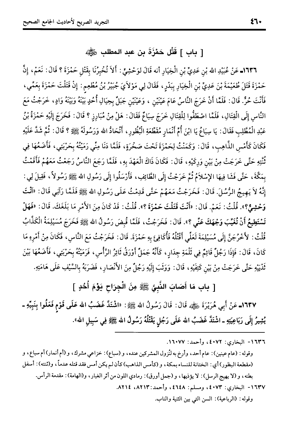 1636 - عَنْ عُبَيْدِاللَّهِ بْنِ عَدِيِّ بْنِ الْخِيَارِ: أنَّهُ قَالَ لِوَحشِيٍّ: أَلا تُخْبِرُنَا بِقَتْلِ حَمْزَةَ؟ قَالَ: نَعَمْ، إِنَّ حَمْزَةَ قَتَلَ طُعَيْمَةَ بْنَ عَدِيِّ بْنِ الْخِيَارِ بِبَدْرٍ، فَقَالَ لِي مَوْلايَ جُبَيْرُ بْنُ مُطْعِمٍ: إِنْ قَتَلْتَ حَمْزَةَ بِعَمِّي فَأَنْتَ حُرٌّ، قَالَ: فَلَمَّا أَنْ خَرَجَ النَّاسُ عَامَ عَيْنَيْنِ، وَعَيْنَيْنِ جَبَلٌ بِحِيَالِ أُحُدٍ بَيْنَهُ وَبَيْنَهُ وَادٍ، خَرَجْتُ مَعَ النَّاسِ إِلَى الْقِتَالِ، فَلَمَّا أَنِ اصْطَفُّوا لِلْقِتَالِ خَرَجَ سِبَاعٌ فَقَالَ: هَلْ مِنْ مُبَارِزٍ؟ قَالَ: فَخَرَجَ إِلَيْهِ حَمْزَةُ بْنُ عَبْدِ الْمُطَّلِبِ، فَقَالَ: يَا سِبَاعُ يَا ابْنَ أُمِّ أَنْمَارٍ مُقَطِّعَةِ الْبُظُورِ، أَتُحَادُّ اللَّهَ وَرَسُولَهُ؟ قَالَ: ثُمَّ شَدَّ عَلَيْهِ فَكَانَ كَأَمْسِ الذَّاهِبِ، قَالَ: وَكَمَنْتُ لِحَمْزَةَ تَحْتَ صَخْرَةٍ، فَلَمَّا دَنَا مِنِّي رَمَيْتُهُ بِحَرْبَتِي، فَأَضَعُهَا فِي ثُنَّتِهِ حَتَّى خَرَجَتْ مِنْ بَيْنِ وَرِكَيْهِ، قَالَ: فَكَانَ ذَاكَ الْعَهْدَ بِهِ، فَلَمَّا رَجَعَ النَّاسُ رَجَعْتُ مَعَهُمْ، فَأَقَمْتُ بِمَكَّةَ حَتَّى فَشَا فِيهَا الإسْلامُ، ثُمَّ خَرَجْتُ إِلَى الطَّائِفِ، فَأَرْسَلُوا إِلَى رَسُولِ اللَّهِ - صلى الله عليه وسلم - رَسُولًا، فَقِيلَ لِي: إِنَّهُ لا يَهِيجُ الرُّسُلَ، قَالَ: فَخَرَجْتُ مَعَهُمْ حَتَّى قَدِمْتُ عَلَى رَسُولِ اللَّهِ - صلى الله عليه وسلم -، فَلَمَّا رَآنِي قَالَ: «آنْتَ وَحْشِيٌّ»؟ قُلْتُ: نَعَمْ، قَالَ: «أَنْتَ قَتَلْتَ حَمْزَةَ»؟ قُلْتُ: قَدْ كَانَ مِنَ الأَمْرِ مَا بَلَغَكَ. قَالَ: «فَهَلْ تَسْتَطِيعُ أَنْ تُغَيِّبَ وَجْهَكَ عَنِّي»؟ قَالَ: فَخَرَجْتُ، فَلَمَّا قُبِضَ رَسُولُ اللَّهِ - صلى الله عليه وسلم - فَخَرَجَ مُسَيْلِمَةُ الْكَذَّابُ قُلْتُ: لَأَخْرُجَنَّ إِلَى مُسَيْلِمَةَ، لَعَلِّي أَقْتُلُهُ فَأُكَافِئَ بِهِ حَمْزَةَ، قَالَ: فَخَرَجْتُ مَعَ النَّاسِ فَكَانَ مِنْ أَمْرِهِ مَا كَانَ، قَالَ: فَإِذَا رَجُلٌ قَائِمٌ فِي ثَلْمَةِ جِدَارٍ كَأَنَّهُ جَمَلٌ أَوْرَقُ ثَائِرُ الرَّأْسِ، قَالَ: فَرَمَيْتُهُ بِحَرْبَتِي، فَأَضَعُهَا بَيْنَ ثَدْيَيْهِ حَتَّى خَرَجَتْ مِنْ بَيْنِ كَتِفَيْهِ، قَالَ: وَوَثَبَ إِلَيْهِ رَجُلٌ مِنَ الأَنْصَارِ فَضَرَبَهُ بِالسَّيْفِ عَلَى هَامَتِهِ. (بخاري: 4072)