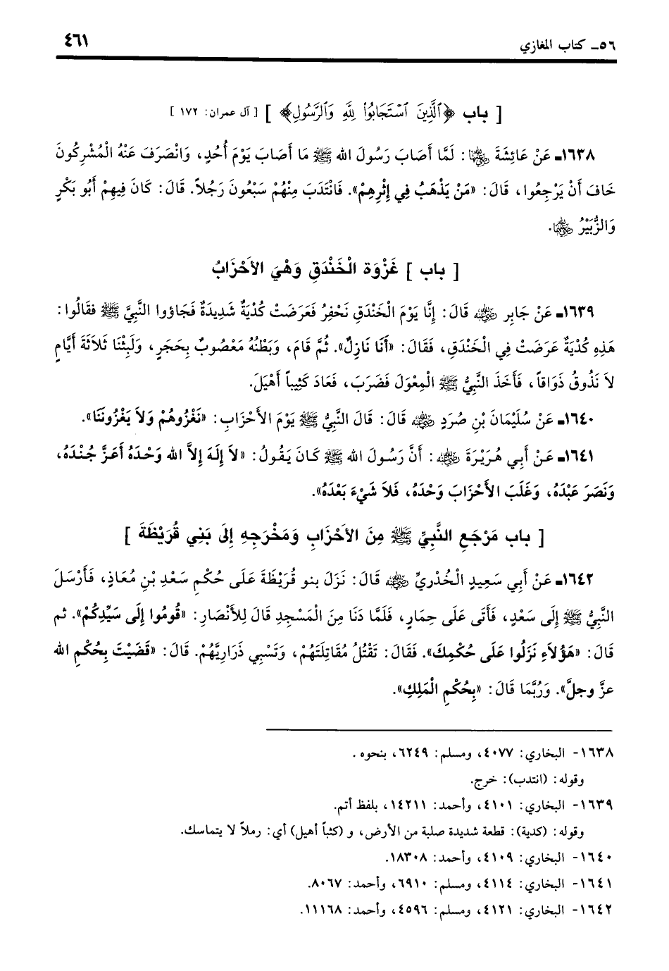 1638 - عَنْ عَائِشَةَ - رضي الله عنها - قَالَتْ: لَمَّا أَصَابَ رَسُولَ اللَّهِ - صلى الله عليه وسلم - مَا أَصَابَ يَوْمَ أُحُدٍ وَانْصَرَفَ عَنْهُ الْمُشْرِكُونَ خَافَ أَنْ يَرْجِعُوا، قَالَ: «مَنْ يَذْهَبُ فِي إِثْرِهِمْ»؟ فَانْتَدَبَ مِنْهُمْ سَبْعُونَ رَجُلًا، قَالَ: كَانَ فِيهِمْ أَبُو بَكْرٍ وَالزُّبَيْرُ - رضي الله عنهما -. (بخاري: 4077)