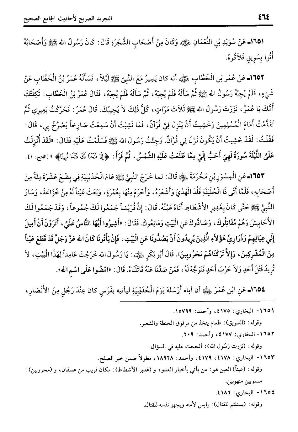 1652 - عَنْ عُمَرَ بْنِ الْخَطَّابِ - رضي الله عنه -: أَنَّه كَانَ يَسِيرُ مَعَ النبي - صلى الله عليه وسلم - لَيْلًا، فَسَأَلَهُ عُمَرُ بْنُ الْخَطَّابِ عَنْ شَيْءٍ فَلَمْ يُجِبْهُ رَسُولُ اللَّهِ - صلى الله عليه وسلم -، ثُمَّ سَأَلَهُ فَلَمْ يُجِبْهُ، ثُمَّ سَأَلَهُ فَلَمْ يُجِبْهُ، وَقَالَ عُمَرُ بْنُ الْخَطَّابِ: ثَكِلَتْكَ أُمُّكَ يَا عُمَرُ، نَزَرْتَ رَسُولَ اللَّهِ - صلى الله عليه وسلم - ثَلاثَ مَرَّاتٍ كُلُّ ذَلِكَ لا يُجِيبُكَ، قَالَ عُمَرُ: فَحَرَّكْتُ بَعِيرِي، ثُمَّ تَقَدَّمْتُ أَمَامَ الْمُسْلِمِينَ وَخَشِيتُ أَنْ يَنْزِلَ فِيَّ قُرْآنٌ، فَمَا نَشِبْتُ أَنْ سَمِعْتُ صَارِخًا يَصْرُخُ بِي، قَالَ: فَقُلْتُ: لَقَدْ خَشِيتُ أَنْ يَكُونَ نَزَلَ فِيَّ قُرْآنٌ، وَجِئْتُ رَسُولَ اللَّهِ - صلى الله عليه وسلم - فَسَلَّمْتُ عَلَيْهِ، فَقَالَ: «لَقَدْ أُنْزِلَتْ عَلَيَّ اللَّيْلَةَ سُورَةٌ لَهِيَ أَحَبُّ إِلَيَّ مِمَّا طَلَعَتْ عَلَيْهِ الشَّمْسُ». ثُمَّ قَرَأَ: {إِنَّا فَتَحْنَا لَكَ فَتْحًا مُبِينًا}. (بخاري: 4177)