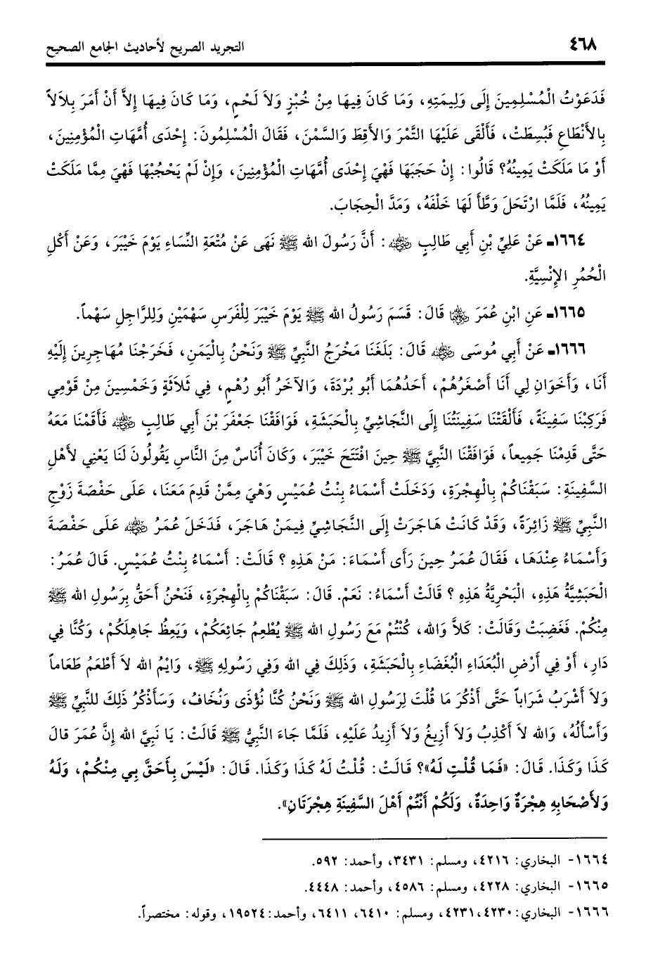 1666 - عَنْ أَبِيْ مُوسَى - رضي الله عنه - قَالَ: بَلَغَنَا مَخْرَجُ النَّبِيِّ - صلى الله عليه وسلم - وَنَحْنُ بِالْيَمَنِ، فَخَرَجْنَا مُهَاجِرِينَ إِلَيْهِ أَنَا وَأَخَوَانِ لِي أَنَا أَصْغَرُهُمْ، أَحَدُهُمَا أَبُو بُرْدَةَ وَالآخَرُ أَبُو رُهْمٍ، فِي ثَلَاثَةٍ وَخَمْسِينَ مِنْ قَوْمِي، فَرَكِبْنَا سَفِينَةً، فَأَلْقَتْنَا سَفِينَتُنَا إِلَى النَّجَاشِيِّ بِالْحَبَشَةِ، فَوَافَقْنَا جَعْفَرَ بْنَ أَبِي طَالِبٍ، فَأَقَمْنَا مَعَهُ حَتَّى قَدِمْنَا جَمِيعًا، فَوَافَقْنَا النَّبِيَّ - صلى الله عليه وسلم - حِينَ افْتَتَحَ خَيْبَرَ، وَكَانَ أُنَاسٌ مِنَ النَّاسِ يَقُولُونَ لَنَا، يَعْنِي لأهْلِ السَّفِينَةِ: سَبَقْنَاكُمْ بِالْهِجْرَةِ. وَدَخَلَتْ أَسْمَاءُ بِنْتُ عُمَيْسٍ -وَهِيَ مِمَّنْ قَدِمَ مَعَنَا- عَلَى حَفْصَةَ زَوْجِ النَّبِيِّ - صلى الله عليه وسلم - زَائِرَةً، وَقَدْ كَانَتْ هَاجَرَتْ إِلَى النَّجَاشِيِّ فِيمَنْ هَاجَرَ، فَدَخَلَ عُمَرُ عَلَى حَفْصَةَ وَأَسْمَاءُ عِنْدَهَا، فَقَالَ عُمَرُ حِينَ رَأَى أَسْمَاءَ: مَنْ هَذِهِ؟ قَالَتْ: أَسْمَاءُ بِنْتُ عُمَيْسٍ، قَالَ عُمَرُ: الْحَبَشِيَّةُ هَذِهِ، الْبَحْرِيَّةُ هَذِهِ؟ قَالَتْ أَسْمَاءُ: نَعَمْ. قَالَ: سَبَقْنَاكُمْ بِالْهِجْرَةِ، فَنَحْنُ أَحَقُّ بِرَسُولِ اللَّهِ - صلى الله عليه وسلم - مِنْكُمْ. فَغَضِبَتْ وَقَالَتْ كَلَّا وَاللَّهِ، كُنْتُمْ مَعَ رَسُولِ اللَّهِ - صلى الله عليه وسلم - يُطْعِمُ جَائِعَكُمْ وَيَعِظُ جَاهِلَكُمْ، وَكُنَّا فِي دَارِ -أَوْ فِي أَرْضِ- الْبُعَدَاءِ الْبُغَضَاءِ بِالْحَبَشَةِ، وَذَلِكَ فِي اللَّهِ وَفِي رَسُولِهِ - صلى الله عليه وسلم -، وَايْمُ اللَّهِ لا أَطْعَمُ طَعَامًا وَلا أَشْرَبُ شَرَابًا حَتَّى أَذْكُرَ مَا قُلْتَ لِرَسُولِ اللَّهِ - صلى الله عليه وسلم -، وَنَحْنُ كُنَّا نُؤْذَى وَنُخَافُ، وَسَأَذْكُرُ ذَلِكَ لِلنَّبِيِّ - صلى الله عليه وسلم - وَأَسْأَلُهُ، وَاللَّهِ لا أَكْذِبُ وَلا أَزِيغُ وَلا أَزِيدُ عَلَيْهِ، فَلَمَّا جَاءَ النَّبِيُّ - صلى الله عليه وسلم - قَالَتْ: يَا نَبِيَّ اللَّهِ، إِنَّ عُمَرَ قَالَ كَذَا وَكَذَا، قَالَ: «فَمَا قُلْتِ لَهُ»؟ قَالَتْ: قُلْتُ لَهُ: كَذَا وَكَذَا، قَالَ: «لَيْسَ بِأَحَقَّ بِي مِنْكُمْ، وَلَهُ وَلأصْحَابِهِ هِجْرَةٌ وَاحِدَةٌ، وَلَكُمْ أَنْتُمْ أَهْلَ السَّفِينَةِ هِجْرَتَانِ». (بخاري: 4230، 4231)