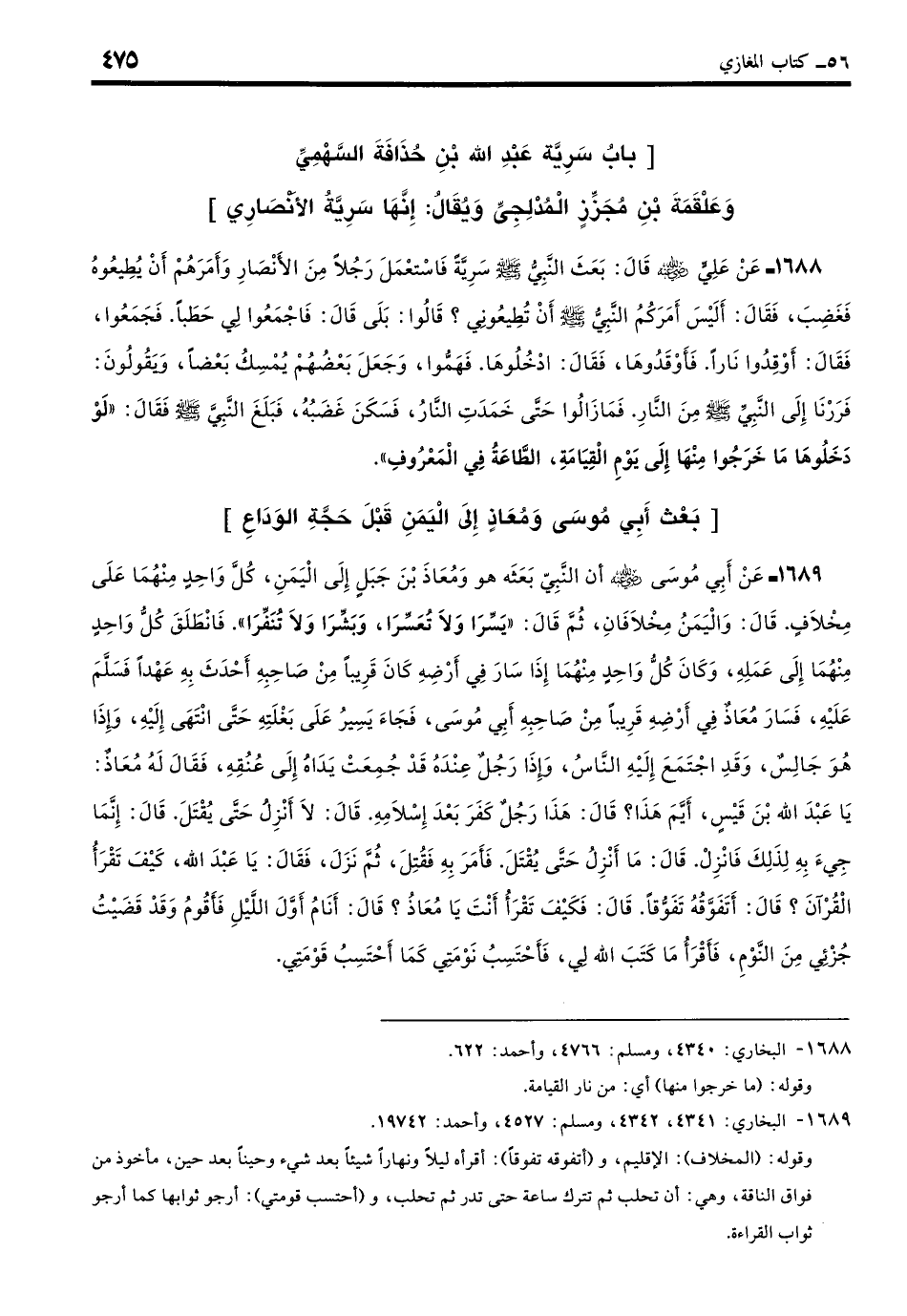 1689 - عَنْ أَبِي مُوسَى - رضي الله عنه - أَنَّ النَّبِيَّ - صلى الله عليه وسلم - بَعَثَه وَمُعَاذَ بْنَ جَبَلٍ إِلَى الْيَمَنِ، قَالَ: وَبَعَثَ كُلَّ وَاحِدٍ مِنْهُمَا عَلَى مِخْلافٍ، قَالَ: وَالْيَمَنُ مِخْلافَانِ، ثُمَّ قَالَ: «يَسِّرَا وَلا تُعَسِّرَا وَبَشِّرَا وَلا تُنَفِّرَا». فَانْطَلَقَ كُلُّ وَاحِدٍ مِنْهُمَا إِلَى عَمَلِهِ، قال: وَكَانَ كُلُّ وَاحِدٍ مِنْهُمَا إِذَا سَارَ فِي أَرْضِهِ كَانَ قَرِيبًا مِنْ صَاحِبِهِ أَحْدَثَ بِهِ عَهْدًا فَسَلَّمَ عَلَيْهِ، فَسَارَ مُعَاذٌ فِي أَرْضِهِ قَرِيبًا مِنْ صَاحِبِهِ أَبِي مُوسَى، فَجَاءَ يَسِيرُ عَلَى بَغْلَتِهِ حَتَّى انْتَهَى إِلَيْهِ، وَإِذَا هُوَ جَالِسٌ وَقَدِ اجْتَمَعَ إِلَيْهِ النَّاسُ، وَإِذَا رَجُلٌ عِنْدَهُ قَدْ جُمِعَتْ يَدَاهُ إِلَى عُنُقِهِ، فَقَالَ لَهُ مُعَاذٌ: يَا عَبْدَ اللَّهِ بْنَ قَيْسٍ أَيُّمَ هَذَا؟ قَالَ: هَذَا رَجُلٌ كَفَرَ بَعْدَ إِسْلامِهِ، قَالَ: لَا أَنْزِلُ حَتَّى يُقْتَلَ، قَالَ: إِنَّمَا جِيءَ بِهِ لِذَلِكَ فَانْزِلْ، قَالَ: مَا أَنْزِلُ حَتَّى يُقْتَلَ، فَأَمَرَ بِهِ فَقُتِلَ ثُمَّ نَزَلَ، فَقَالَ: يَا عَبْدَ اللَّهِ كَيْفَ تَقْرَأُ الْقُرْآنَ؟ قَالَ: أَتَفَوَّقُهُ تَفَوُّقًا، قَالَ: فَكَيْفَ تَقْرَأُ أَنْتَ يَا مُعَاذُ؟ قَالَ: أَنَامُ أَوَّلَ اللَّيْلِ فَأَقُومُ وَقَدْ قَضَيْتُ جُزْئِي مِنَ النَّوْمِ فَأَقْرَأُ مَا كَتَبَ اللَّهُ لِي، فَأَحْتَسِبُ نَوْمَتِي كَمَا أَحْتَسِبُ قَوْمَتِي. (بخاري: 4342)