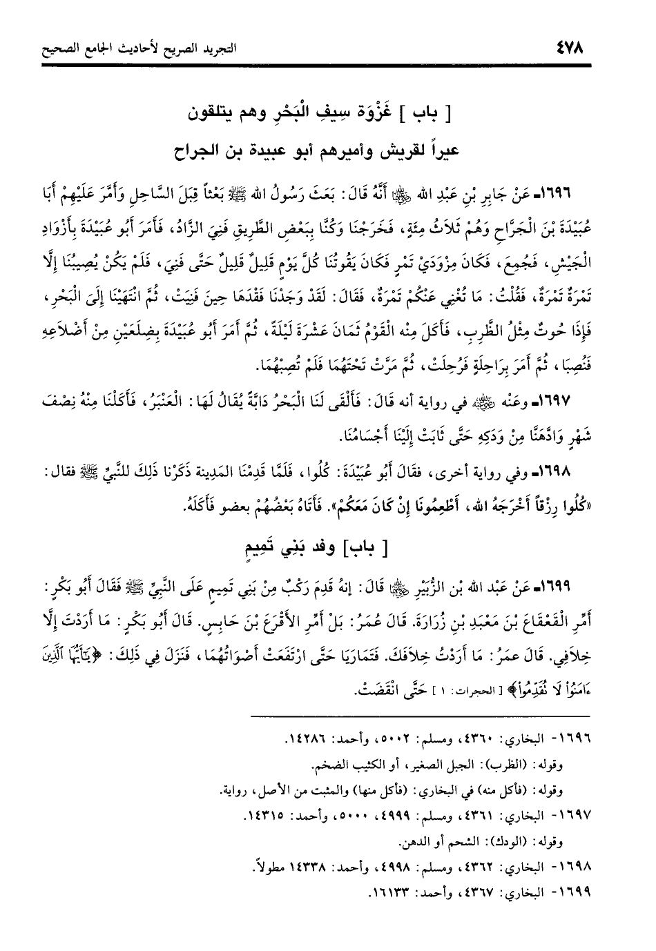 1696 - عَنْ جَابِرِ بْنِ عَبْدِ اللَّهِ - رضي الله عنهما - أَنَّهُ قَالَ: بَعَثَ رَسُولُ اللَّهِ - صلى الله عليه وسلم - بَعْثًا قِبَلَ السَّاحِلِ وَأَمَّرَ عَلَيْهِمْ أَبَا عُبَيْدَةَ بْنَ الْجَرَّاحِ، وَهُمْ ثَلاثُ مِائَةٍ، فَخَرَجْنَا وَكُنَّا بِبَعْضِ الطَّرِيقِ فَنِيَ الزَّادُ، فَأَمَرَ أَبُو عُبَيْدَةَ بِأَزْوَادِ الْجَيْشِ فَجُمِعَ، فَكَانَ مِزْوَدَيْ تَمْرٍ، فَكَانَ يَقُوتُنَا كُلَّ يَوْمٍ قَلِيلٌ قَلِيلٌ حَتَّى فَنِيَ، فَلَمْ يَكُنْ يُصِيبُنَا إِلا تَمْرَةٌ تَمْرَةٌ، فَقُلْتُ: مَا تُغْنِي عَنْكُمْ تَمْرَةٌ؟ فَقَالَ: لَقَدْ وَجَدْنَا فَقْدَهَا حِينَ فَنِيَتْ، ثُمَّ انْتَهَيْنَا إِلَى الْبَحْرِ، فَإِذَا حُوتٌ مِثْلُ الظَّرِبِ، فَأَكَلَ مِنْهَا الْقَوْمُ ثَمَانِيَ عَشْرَةَ لَيْلَةً، ثُمَّ أَمَرَ أَبُو عُبَيْدَةَ بِضِلَعَيْنِ مِنْ أَضْلاعِهِ فَنُصِبَا ثُمَّ أَمَرَ بِرَاحِلَةٍ فَرُحِلَتْ ثُمَّ مَرَّتْ تَحْتَهُمَا فَلَمْ تُصِبْهُمَا. (بخاري: 4360)