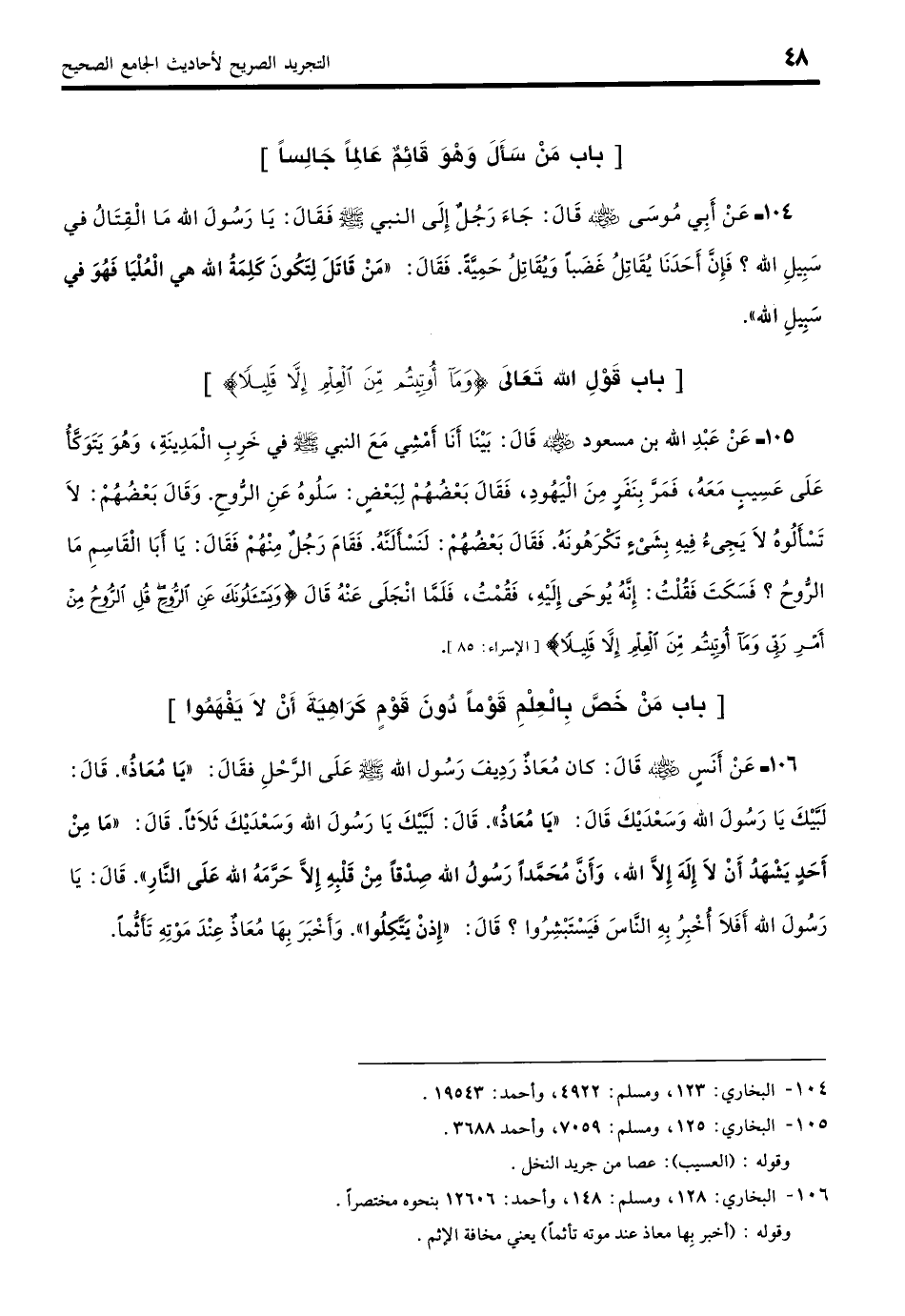 106 - عَنْ أَنَسِ بْنِ مَالِكٍ: - رضي الله عنه - أَنَّ النَّبِيَّ - صلى الله عليه وسلم - وَمُعاذٌ رَدِيفُهُ عَلَى الرَّحْلِ قَالَ: «يَا مُعَاذَ بْنَ جَبَلٍ»! قَالَ: لَبَّيْكَ يَا رَسُولَ اللَّهِ وَسَعْدَيْكَ، قَالَ: «يَا مُعَاذُ»! قَالَ: لَبَّيْكَ يَا رَسُولَ اللَّهِ وَسَعْدَيْكَ، ثَلاثًا، قَالَ: «مَا مِنْ أَحَدٍ يَشْهَدُ أَنْ لَا إِلَهَ إِلَّا اللَّهُ وَأَنَّ مُحَمَّدًا رَسُولُ اللَّهِ صِدْقًا مِنْ قَلْبِهِ إِلَّا حَرَّمَهُ اللَّهُ عَلَى النَّارِ». قَالَ: يَا رَسُولَ اللَّهِ، أَفَلا أُخْبِرُ بِهِ النَّاسَ فَيَسْتَبْشِرُوا؟ قَالَ: «إِذًا يَتَّكِلُوا». وَأَخْبَرَ بِهَا مُعَاذٌ عِنْدَ مَوْتِهِ تَأَثُّمًا. (بخاري: 128)