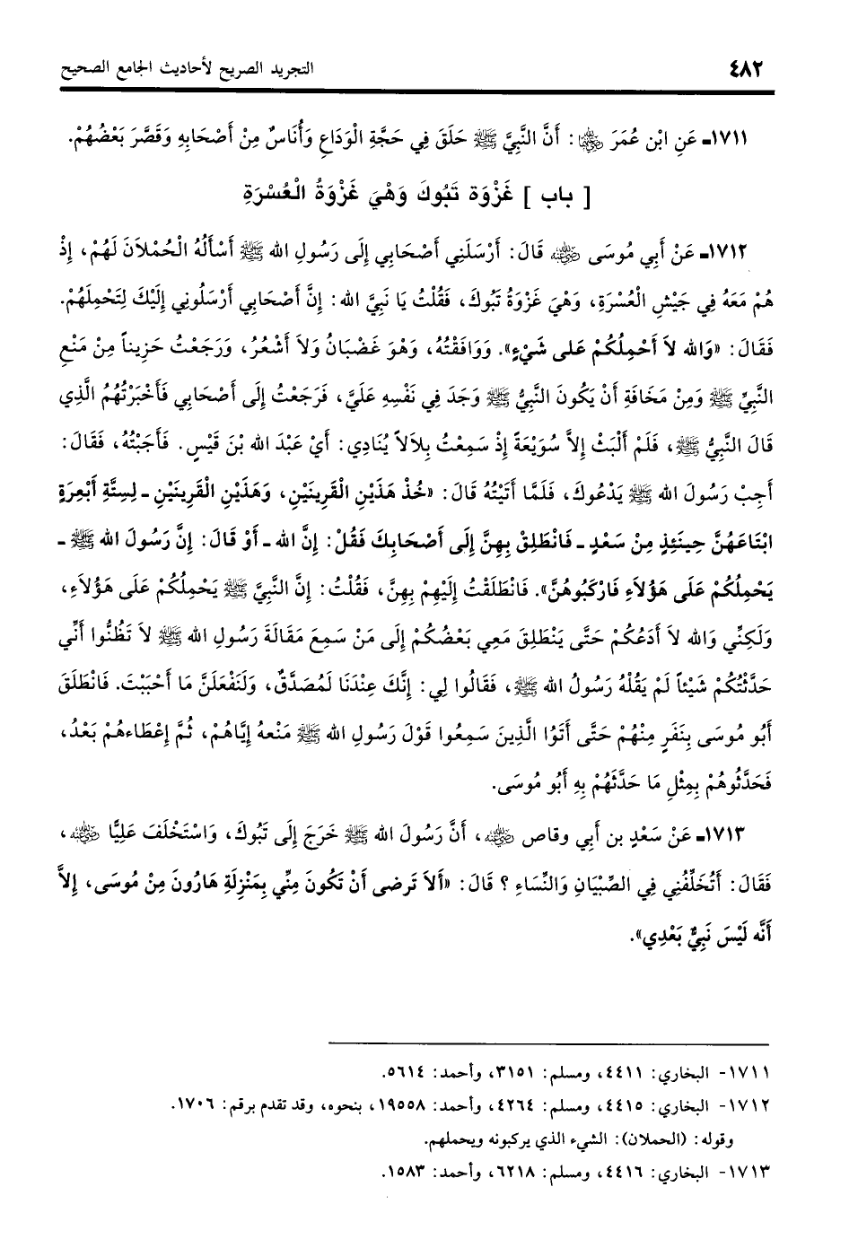1712 - عَنْ أَبِي مُوسَى - رضي الله عنه - قَالَ: أَرْسَلَنِي أَصْحَابِي إِلَى رَسُولِ اللَّهِ - صلى الله عليه وسلم - أَسْأَلُهُ الْحُمْلانَ لَهُمْ، إِذْ هُمْ مَعَهُ فِي جَيْشِ الْعُسْرَةِ وَهِيَ غَزْوَةُ تَبُوكَ فَقُلْتُ: يَا نَبِيَّ اللَّهِ! إِنَّ أَصْحَابِي أَرْسَلُونِي إِلَيْكَ لِتَحْمِلَهُمْ، فَقَالَ: «وَاللَّهِ لا أَحْمِلُكُمْ عَلَى شَيْءٍ». وَوَافَقْتُهُ وَهُوَ غَضْبَانُ وَلا أَشْعُرُ، وَرَجَعْتُ حَزِينًا مِنْ مَنْعِ النَّبِيِّ - صلى الله عليه وسلم - وَمِنْ مَخَافَةِ أَنْ يَكُونَ النَّبِيُّ - صلى الله عليه وسلم - وَجَدَ فِي نَفْسِهِ عَلَيَّ، فَرَجَعْتُ إِلَى أَصْحَابِي فَأَخْبَرْتُهُمِ الَّذِي قَالَ النَّبِيُّ - صلى الله عليه وسلم -، فَلَمْ أَلْبَثْ إِلا سُوَيْعَةً إِذْ سَمِعْتُ بِلالًا يُنَادِي: أَيْ عَبْدَ اللَّهِ بْنَ قَيْسٍ، فَأَجَبْتُهُ فَقَالَ: أَجِبْ رَسُولَ اللَّهِ - صلى الله عليه وسلم - يَدْعُوكَ، فَلَمَّا أَتَيْتُهُ قَالَ: «خُذْ هَذَيْنِ الْقَرِينَيْنِ، وَهَذَيْنِ الْقَرِينَيْنِ -لِسِتَّةِ أَبْعِرَةٍ ابْتَاعَهُنَّ حِينَئِذٍ مِنْ سَعْدٍ- فَانْطَلِقْ بِهِنَّ إِلَى أَصْحَابِكَ، فَقُلْ: إِنَّ اللَّهَ -أَوْ قَالَ: إِنَّ رَسُولَ اللَّهِ - صلى الله عليه وسلم - يَحْمِلُكُمْ عَلَى هَؤُلاءِ فَارْكَبُوهُنَّ». فَانْطَلَقْتُ إِلَيْهِمْ بِهِنَّ فَقُلْتُ: إِنَّ النَّبِيَّ - صلى الله عليه وسلم - يَحْمِلُكُمْ عَلَى هَؤُلاءِ، وَلَكِنِّي وَاللَّهِ لا أَدَعُكُمْ حَتَّى يَنْطَلِقَ مَعِي بَعْضُكُمْ إِلَى مَنْ سَمِعَ مَقَالَةَ رَسُولِ اللَّهِ - صلى الله عليه وسلم -، لا تَظُنُّوا أَنِّي حَدَّثْتُكُمْ شَيْئًا لَمْ يَقُلْهُ رَسُولُ اللَّهِ - صلى الله عليه وسلم -، فَقَالُوا لِي: وَاللَّهِ إِنَّكَ عِنْدَنَا لَمُصَدَّقٌ وَلَنَفْعَلَنَّ مَا أَحْبَبْتَ، فَانْطَلَقَ أَبُو مُوسَى بِنَفَرٍ مِنْهُمْ حَتَّى أَتَوْا الَّذِينَ سَمِعُوا قَوْلَ رَسُولِ اللَّهِ - صلى الله عليه وسلم - مَنْعَهُ إِيَّاهُمْ ثُمَّ إِعْطَاءَهُمْ بَعْدُ، فَحَدَّثُوهُمْ بِمِثْلِ مَا حَدَّثَهُمْ بِهِ أَبُو مُوسَى. (بخاري: 4415)