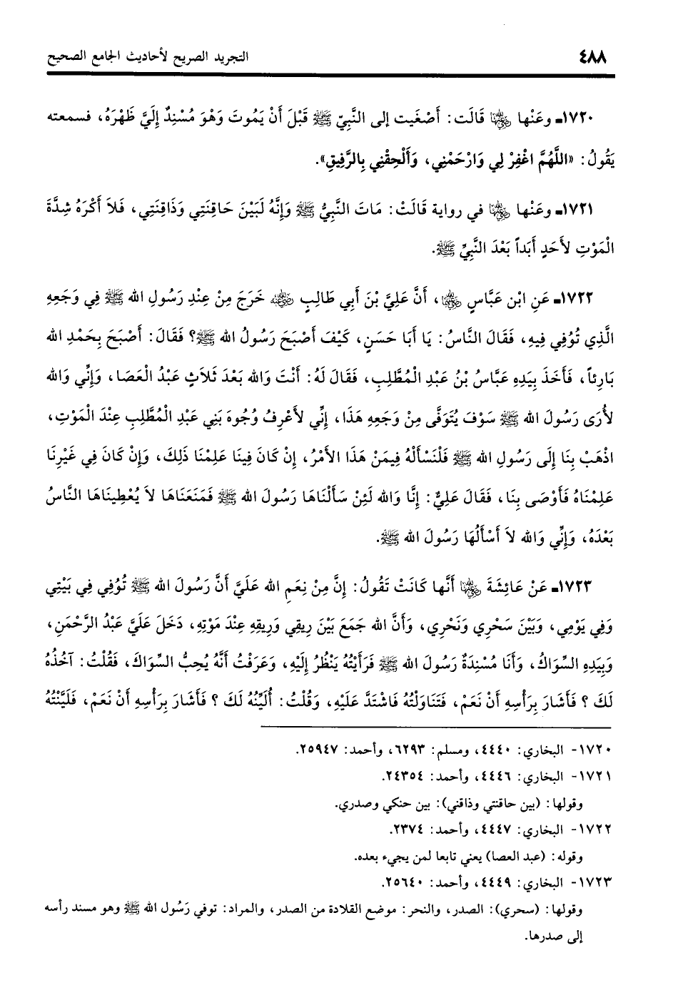 1720 - وَعَنْهَا: أَنَّهَا أَصْغَتْ إِلَى النَّبِيِّ - صلى الله عليه وسلم - قَبْلَ أَنْ يَمُوتَ وَهُوَ مُسْنِدٌ إِلَيَّ ظَهْرَهُ يَقُولُ: «اللَّهُمَّ اغْفِرْ لِي وَارْحَمْنِي وَأَلْحِقْنِي بِالرَّفِيقِ». (بخاري: 4440)