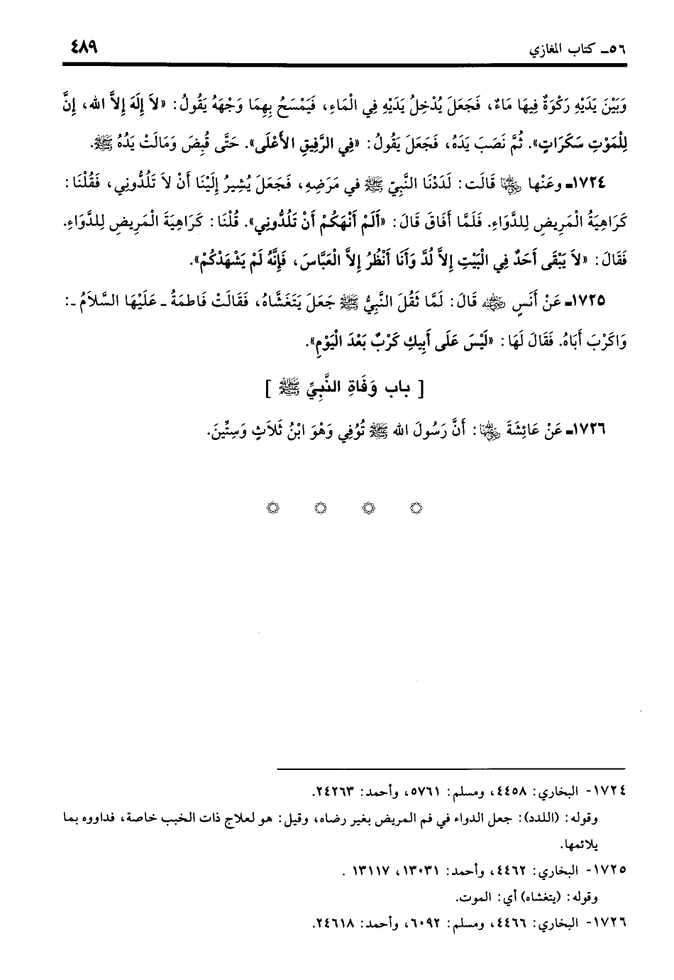 1725 - عَنْ أَنَسٍ - رضي الله عنه - قَالَ: لَمَّا ثَقُلَ النَّبِيُّ - صلى الله عليه وسلم - جَعَلَ يَتَغَشَّاهُ فَقَالَتْ فَاطِمَةُ عليها السلام: وَاكَرْبَ أَبَاهُ، فَقَالَ لَهَا: «لَيْسَ عَلَى أَبِيكِ كَرْبٌ بَعْدَ الْيَوْمِ». (بخاري: 4462)