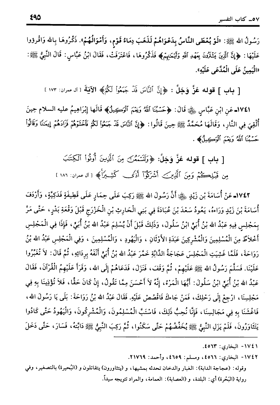 1742 - عَنْ أُسَامَةَ بْنِ زَيْدٍ - رضي الله عنهما -: أَنَّ رَسُولَ اللَّهِ - صلى الله عليه وسلم - رَكِبَ عَلَى حِمَارٍ، عَلَى قَطِيفَةٍ فَدَكِيَّةٍ، وَأَرْدَفَ أُسَامَةَ بْنَ زَيْدٍ وَرَاءَهُ يَعُودُ سَعْدَ بْنَ عُبَادَةَ فِي بَنِي الْحَارِث بْنِ الْخَزْرَجِ قَبْلَ وَقْعَةِ بَدْرٍ، حَتَّى مَرَّ بِمَجْلِسٍ فِيهِ عَبْدُ اللَّهِ بْنُ أُبَيٍّ ابْنُ سَلُولَ، وَذَلِكَ قَبْلَ أَنْ يُسْلِمَ عَبْدُ اللَّهِ بْنُ أُبَيٍّ، فَإِذَا فِي الْمَجْلِسِ أَخْلاطٌ مِنَ الْمُسْلِمِينَ وَالْمُشْرِكِينَ عَبَدَةِ الأَوْثانِ وَالْيَهُودِ وَالْمُسْلِمِين، وَفِي الْمَجْلِسِ عَبْدُ اللَّهِ بْنُ رَوَاحَةَ، فَلَمَّا غَشِيَتِ الْمَجْلِسَ عَجَاجَةُ الدَّابَّةِ، خَمَّرَ عَبْدُ اللَّهِ بْنُ أُبَيٍّ أَنْفَهُ بِرِدَائِهِ، ثمَّ قَالَ: لا تُغَبِّرُوا عَلَيْنَا، فَسَلَّمَ رَسُولُ اللَّهِ - صلى الله عليه وسلم - عَلَيْهِمْ، ثمَّ وَقَفَ، فَنَزَلَ فَدَعَاهُمْ إِلَى اللَّهِ وَقَرَأَ عَلَيْهِمُ الْقُرْآنَ، فَقَالَ عَبْدُ اللَّهِ بْنُ أُبَيٍّ ابْنُ سَلُولَ: أَيُّهَا الْمَرْءُ، إِنَّهُ لا أَحْسَنَ مِمَّا تَقُولُ، إِنْ كَانَ حَقًّا فَلا تُؤْذِنَا بِهِ فِي مَجْلِسِنَا، ارْجِعْ إِلَى رَحْلِكَ فَمَنْ جَاءَكَ فَاقْصُصْ عَلَيْهِ، فَقَالَ عَبْدُ اللَّهِ بْنُ رَوَاحَةَ: بَلَى يَا رَسُولَ اللَّهِ فَاغْشَنَا بِهِ فِي مَجَالِسِنَا فَإِنَّا نُحِبُّ ذَلِكَ، فَاسْتَبَّ الْمُسْلِمُونَ وَالْمُشْرِكُونَ وَالْيَهُودُ حَتَّى كَادُوا يَتَثاوَرُونَ، فَلَمْ يَزَلِ النَّبِيُّ - صلى الله عليه وسلم - يُخَفِّضُهُمْ حَتَّى سَكَنُوا، ثمَّ رَكِبَ النَّبِيُّ - صلى الله عليه وسلم - دَابَّتَهُ فَسَارَ حَتَّى دَخَلَ