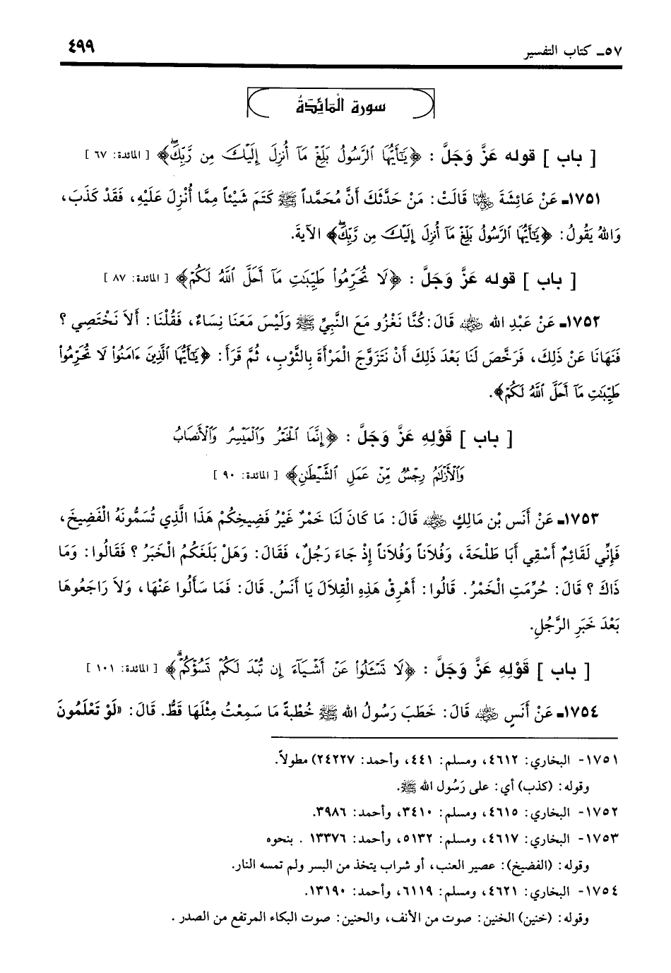 1751 - عَنْ عَائِشَةَ - رضي الله عنها - قَالَتْ: مَنْ حَدَّثكَ أَنَّ مُحَمَّدًا - صلى الله عليه وسلم - كَتَمَ شَيْئًا مِمَّا أَنْزَلَ اللَّهُ عَلَيْهِ فَقَدْ كَذَبَ، وَاللَّهُ يَقُولُ: {يَا أَيُّهَا الرَّسُولُ بَلِّغْ مَا أُنْزِلَ إِلَيْكَ مِنْ رَبِّكَ} الآيَةَ. (بخاري: 4612)