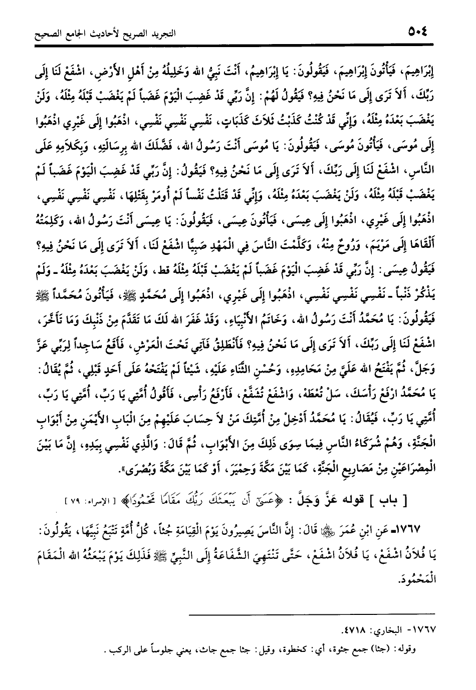 1767 - عَنِ ابْنِ عُمَرَ - رضي الله عنهما - يَقُولُ: إِنَّ النَّاسَ يَصِيرُونَ يَوْمَ الْقِيَامَةِ جُثا كُلُّ أُمَّةٍ تَتْبَعُ نَبِيَّهَا، يَقُولُونَ: يَا فُلانُ اشْفَعْ، يَا فُلانُ اشْفَعْ، حَتَّى تَنْتَهِيَ الشَّفَاعَةُ إِلَى النَّبِيِّ - صلى الله عليه وسلم -، فَذَلِكَ يَوْمَ يَبْعَثهُ اللَّهُ الْمَقَامَ الْمَحْمُودَ. (بخاري: 4718)