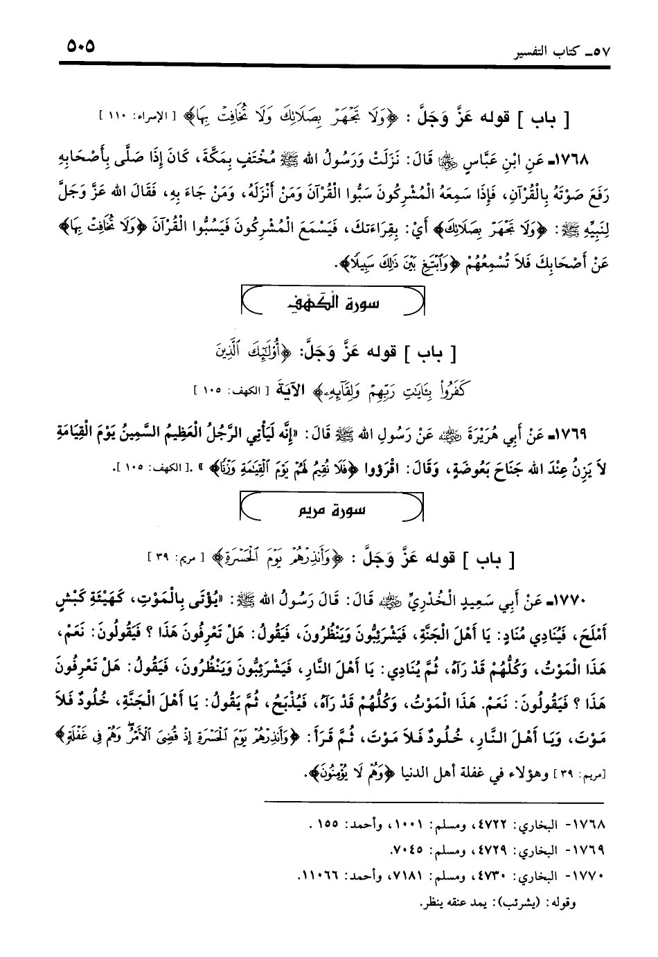 1770 - عَنْ أَبِي سَعِيدٍ الْخُدْرِيِّ - رضي الله عنه - قَالَ: قَالَ رَسُولُ اللَّهِ - صلى الله عليه وسلم -: «يُؤْتَى بِالْمَوْتِ كَهَيْئَةِ كَبْشٍ أَمْلَحَ، فَيُنَادِي مُنَادٍ: يَا أَهْلَ الْجَنَّةِ، فَيَشْرَئِبُّونَ وَيَنْظُرُونَ، فَيَقُولُ: هَلْ تَعْرِفُونَ هَذَا؟ فَيَقُولُونَ: نَعَمْ، هَذَا الْمَوْتُ، وَكُلُّهُمْ قَدْ رَآهُ، ثمَّ يُنَادِي: يَا أَهْلَ النَّارِ، فَيَشْرَئِبُّونَ وَيَنْظُرُونَ، فَيَقُولُ: هَلْ تَعْرِفُونَ هَذَا؟ فَيَقُولُونَ: نَعَمْ، هَذَا الْمَوْتُ، وَكُلُّهُمْ قَدْ رَآهُ، فَيُذْبَحُ، ثمَّ يَقُولُ: يَا أَهْلَ الْجَنَّةِ خُلُودٌ فَلَا مَوْتَ، وَيَا أَهْلَ النَّارِ خُلُودٌ فَلَا مَوْتَ»، ثمَّ قَرَأَ: " {وَأَنْذِرْهُمْ يَوْمَ الْحَسْرَةِ إِذْ قُضِيَ الأَمْرُ وَهُمْ فِي غَفْلَةٍ} وَهَؤُلاءِ فِي غَفْلَةٍ أَهْلُ الدُّنْيَا {وَهُمْ لا يُؤْمِنُونَ} ". (بخاري: 4730)