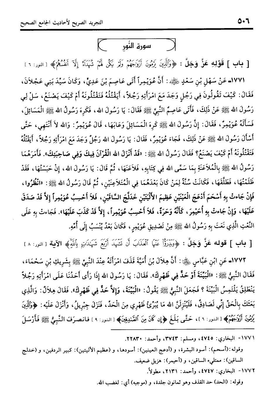 1771 - عَنْ سَهْلِ بْنِ سَعْدٍ - رضي الله عنه -: أَنَّ عُوَيْمِرًا أَتَى عَاصِمَ بْنَ عَدِيٍّ -وَكَانَ سَيِّدَ بَنِي عَجْلانَ- فَقَالَ: كَيْفَ تَقُولُونَ فِي رَجُلٍ وَجَدَ مَعَ امْرَأَتِهِ رَجُلًا، أَيَقْتُلُهُ فَتَقْتُلُونَهُ أَمْ كَيْفَ يَصْنَعُ؟ سَلْ لِي رَسُولَ اللَّهِ - صلى الله عليه وسلم - عَنْ ذَلِكَ، فَأَتَى عَاصِمٌ النَّبِيَّ - صلى الله عليه وسلم - فَقَالَ: يَا رَسُولَ اللَّهِ، فَكَرِهَ رَسُولُ اللَّهِ - صلى الله عليه وسلم - الْمَسَائِلَ، فَسَأَلَهُ عُوَيْمِرٌ فَقَالَ: إِنَّ رَسُولَ اللَّهِ - صلى الله عليه وسلم - كَرِهَ الْمَسَائِلَ وَعَابَهَا، قَالَ عُوَيْمِرٌ: وَاللَّهِ لا أَنْتَهِي حَتَّى أَسْأَلَ رَسُولَ اللَّهِ - صلى الله عليه وسلم - عَنْ ذَلِكَ، فَجَاءَ عُوَيْمِرٌ فَقَالَ: يَا رَسُولَ اللَّهِ رَجُلٌ وَجَدَ مَعَ امْرَأَتِهِ رَجُلًا أَيَقْتُلُهُ فَتَقْتُلُونَهُ أَمْ كَيْفَ يَصْنَعُ؟ فَقَالَ رَسُولُ اللَّهِ - صلى الله عليه وسلم -: «قَدْ أَنْزَلَ اللَّهُ الْقُرْآنَ فِيكَ وَفِي صَاحِبَتِكَ». فَأَمَرَهُمَا رَسُولُ اللَّهِ - صلى الله عليه وسلم - بِالْمُلاعَنَةِ بِمَا سَمَّى اللَّهُ فِي كِتَابِهِ، فَلاعَنَهَا، ثمَّ قَالَ: يَا رَسُولَ اللَّهِ إِنْ حَبَسْتُهَا فَقَدْ ظَلَمْتُهَا، فَطَلَّقَهَا، فَكَانَتْ سُنَّةً لِمَنْ كَانَ بَعْدَهُمَا فِي الْمُتَلاعِنَيْنِ، ثمَّ قَالَ رَسُولُ اللَّهِ - صلى الله عليه وسلم -: «انْظُرُوا فَإِنْ جَاءَتْ بِهِ أَسْحَمَ أَدْعَجَ الْعَيْنَيْنِ عَظِيمَ الأَلْيَتَيْنِ خَدَلَّجَ السَّاقَيْنِ، فَلا أَحْسِبُ عُوَيْمِرًا إِلَّا قَدْ صَدَقَ عَلَيْهَا، وَإِنْ جَاءَتْ بِهِ أُحَيْمِرَ كَأَنَّهُ وَحَرَةٌ، فَلا أَحْسِبُ عُوَيْمِرًا إِلَّا قَدْ كَذَبَ عَلَيْهَا». فَجَاءَتْ بِهِ عَلَى النَّعْتِ الَّذِي نَعَتَ بِهِ رَسُولُ اللَّهِ - صلى الله عليه وسلم - مِنْ تَصْدِيقِ عُوَيْمِرٍ، فَكَانَ بَعْدُ يُنْسَبُ إِلَى أُمِّهِ. (بخاري: 4745)