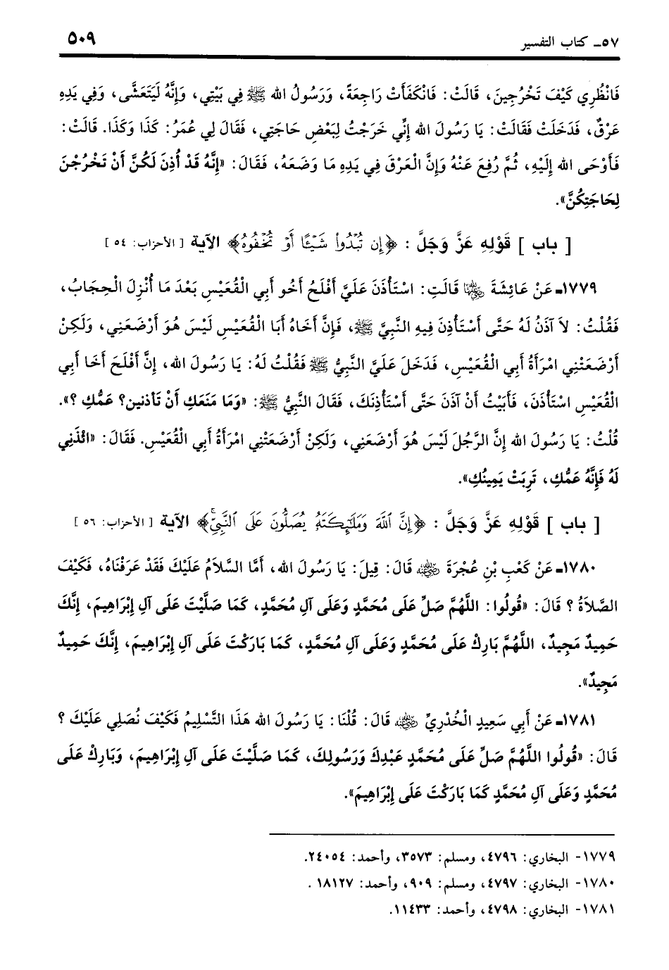 1780 - عَنْ كَعْبِ بْنِ عُجْرَةَ - رضي الله عنه - قِيلَ: يَا رَسُولَ اللَّهِ، أَمَّا السَّلامُ عَلَيْكَ فَقَدْ عَرَفْنَاهُ، فَكَيْفَ الصَّلاةُ عَلَيْكَ؟ قَالَ: «قُولُوا: اللَّهُمَّ صَلِّ عَلَى مُحَمَّدٍ وَعَلَى آلِ مُحَمَّدٍ كَمَا صَلَّيْتَ عَلَى آلِ إِبْرَاهِيمَ إِنَّكَ حَمِيدٌ مَجِيدٌ، اللَّهُمَّ بَارِكْ عَلَى مُحَمَّدٍ وَعَلَى آلِ مُحَمَّدٍ كَمَا بَارَكْتَ عَلَى آلِ إِبْرَاهِيمَ إِنَّكَ حَمِيدٌ مَجِيدٌ». (بخاري: 4797)