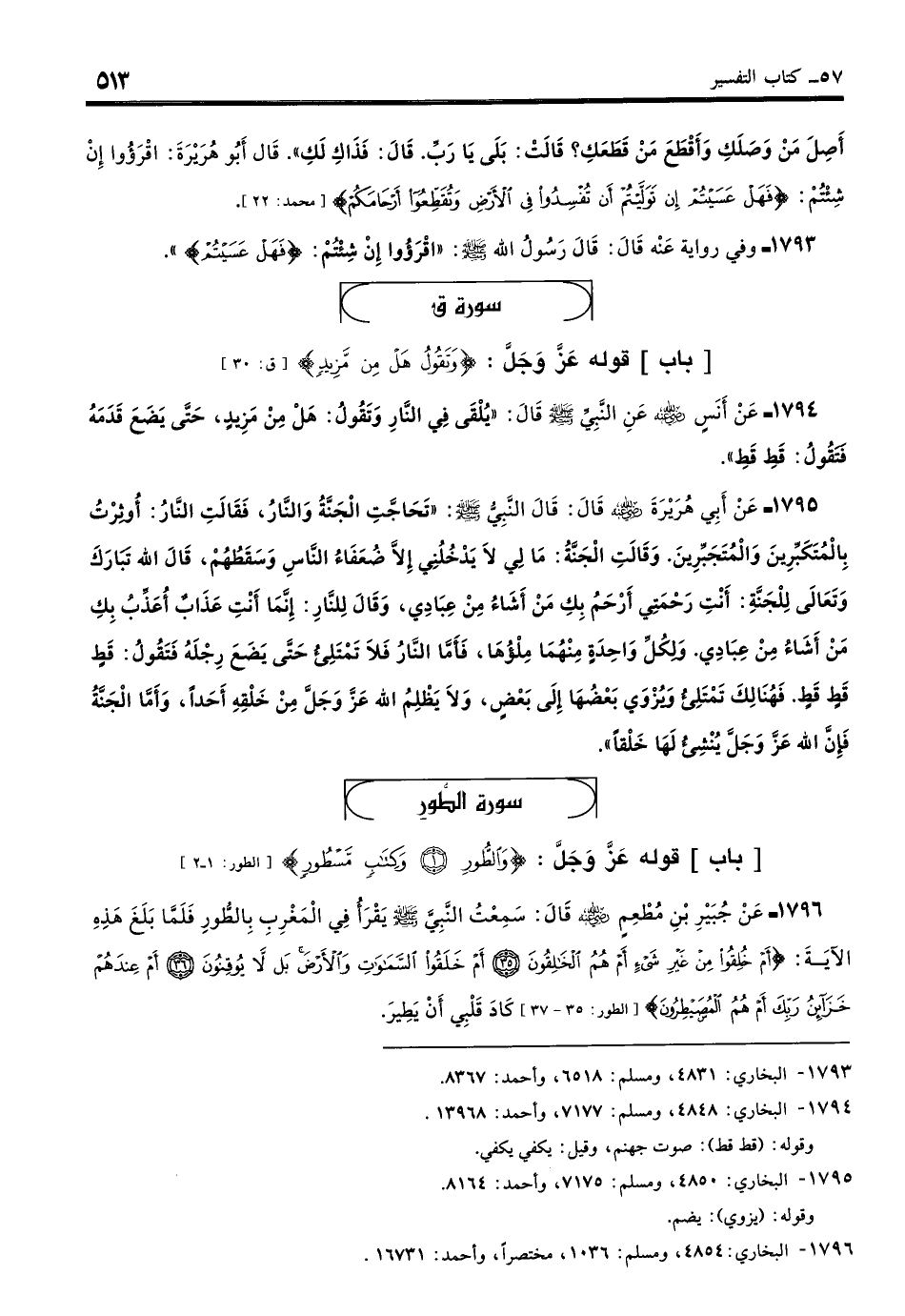 1794 - عَنْ أَنَسٍ - رضي الله عنه - عَنِ النَّبِيِّ - صلى الله عليه وسلم - قَالَ: «يُلْقَى فِي النَّارِ، {وَتَقُولُ هَلْ مِنْ مَزِيدٍ} حَتَّى يَضَعَ قَدَمَهُ، فَتَقُولُ: قَطْ قَطْ». (بخاري: 4848)