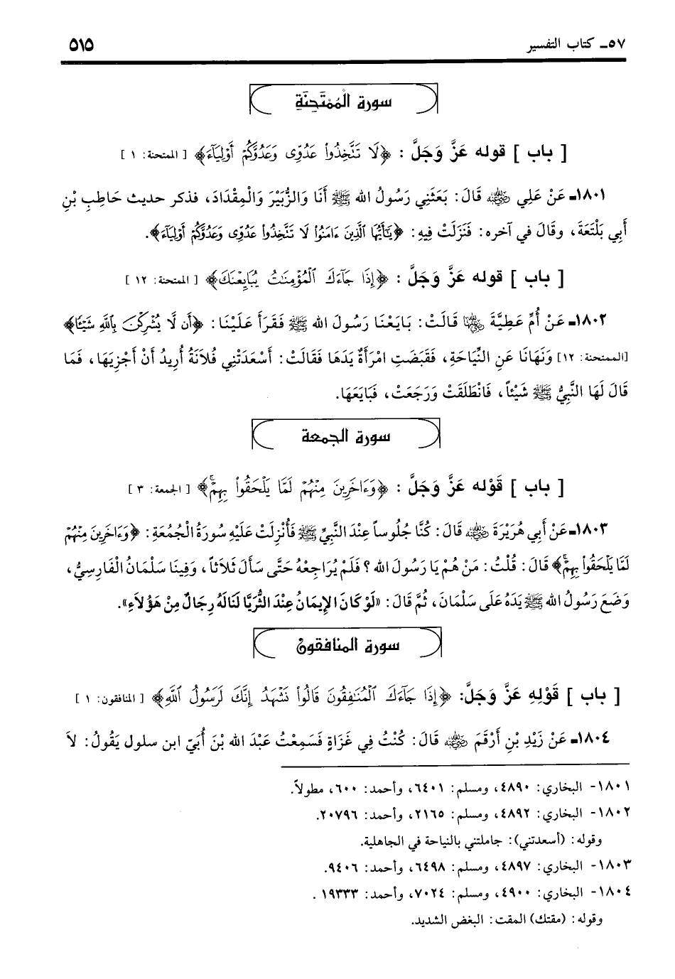 1801 - عَنْ عَلِيٍّ - رضي الله عنه - يَقُولُ: بَعَثنِي رَسُولُ اللَّهِ - صلى الله عليه وسلم - أَنَا وَالزُّبَيْرَ وَالْمِقْدَادَ، فَذَكَرَ حَدِيْثَ حَاطِبِ بْنِ أَبِيْ بَلْتَعَةَ وَقَالَ فِي آخِرِهِ: فنَزَلَتْ فِيهِ: {يا أَيُّهَا الَّذِينَ آمَنُوا لا تَتَّخِذُوا عَدُوِّي وَعَدُوَّكُمْ أَوْلِيَاءَ}. (بخاري: 4890)