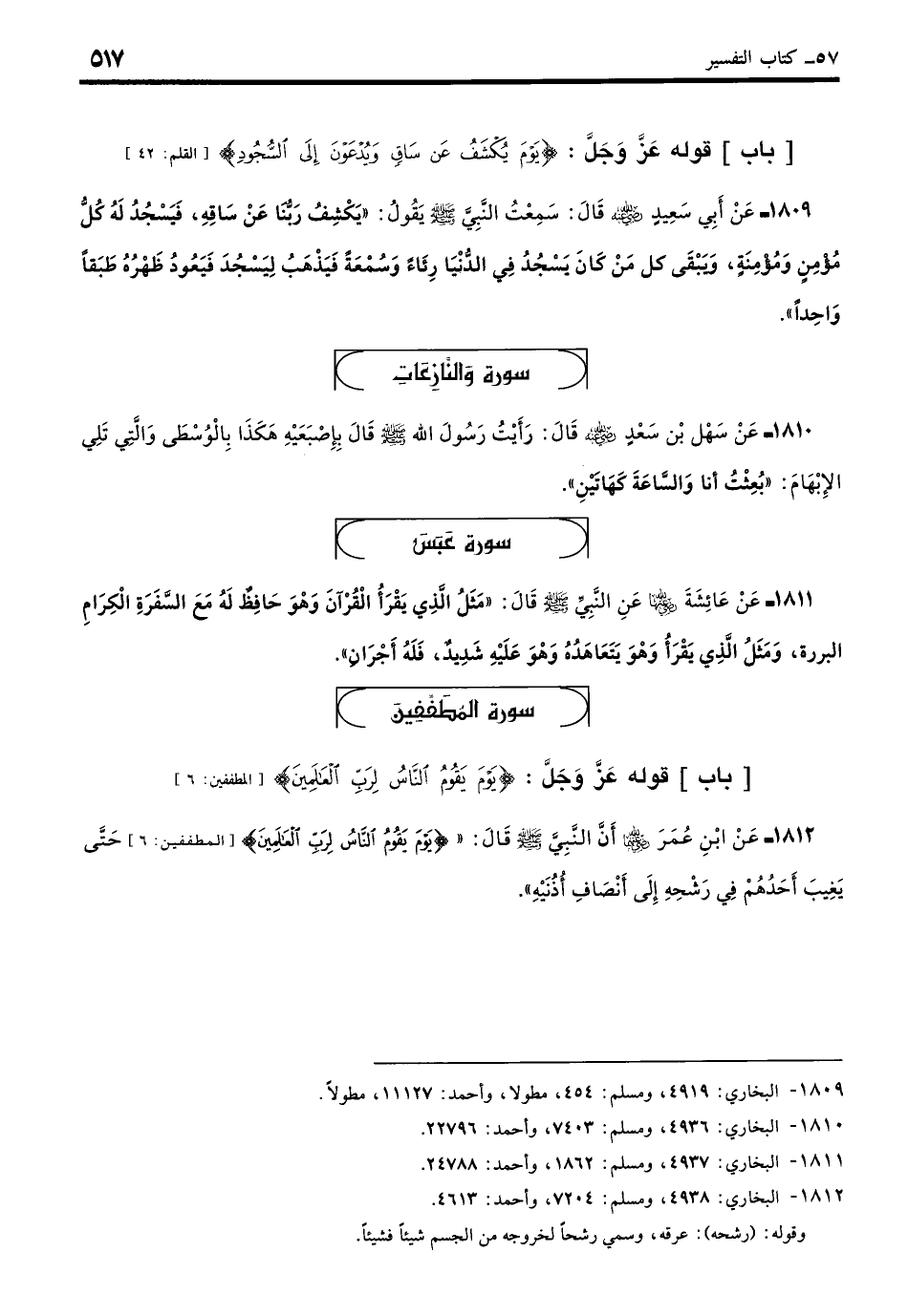1809 - عَنْ أَبِي سَعِيدٍ - رضي الله عنه - قَالَ: سَمِعْتُ النَّبِيَّ - صلى الله عليه وسلم - يَقُولُ: «يَكْشِفُ رَبُّنَا عَنْ سَاقِهِ فَيَسْجُدُ لَهُ كُلُّ مُؤْمِنٍ وَمُؤْمِنَةٍ، فَيَبْقَى كُلُّ مَنْ كَانَ يَسْجُدُ فِي الدُّنْيَا رِيَاءً وَسُمْعَةً فَيَذْهَبُ لِيَسْجُدَ فَيَعُودُ ظَهْرُهُ طَبَقًا وَاحِدًا». (بخاري: 4919)