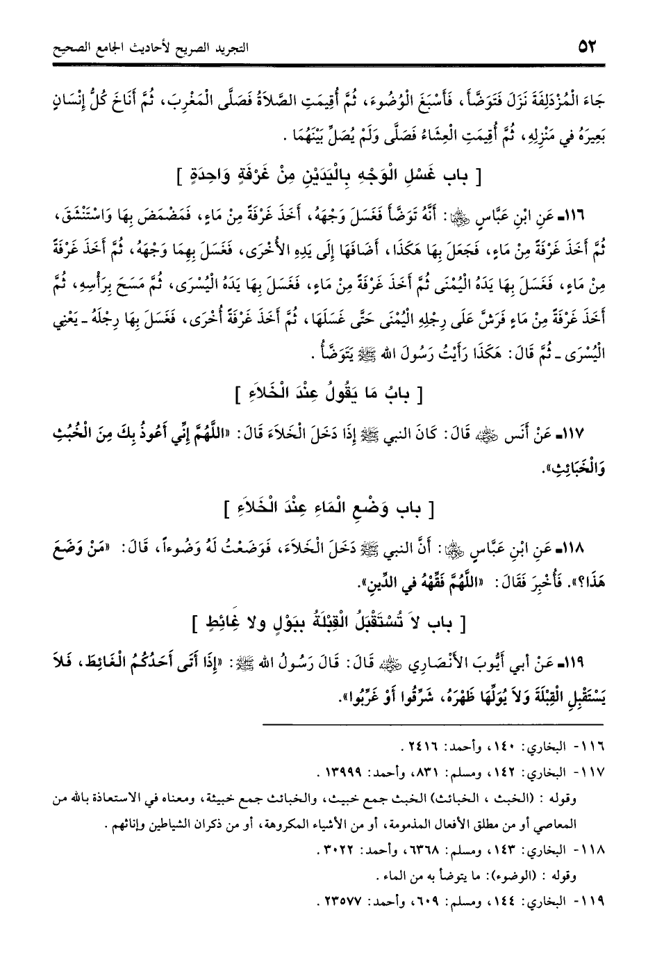 116 - عَنِ ابْنِ عَبَّاسٍ - رضي الله عنهما -: أَنَّهُ تَوَضَّأَ فَغَسَلَ وَجْهَهُ أَخَذَ غَرْفَةً مِنْ مَاءٍ فَمَضْمَضَ بِهَا وَاسْتَنْشَقَ، ثُمَّ أَخَذَ غَرْفَةً مِنْ مَاءٍ فَجَعَلَ بِهَا هَكَذَا، أَضَافَهَا إِلَى يَدِهِ الأُخْرَى فَغَسَلَ بِهَا وَجْهَهُ، ثمَّ أَخَذَ غَرْفَةً مِنْ مَاءٍ فَغَسَلَ بِهَا يَدَهُ الْيُمْنَى، ثمَّ أَخَذَ غَرْفَةً مِنْ مَاءٍ فَغَسَلَ بِهَا يَدَهُ الْيُسْرَى ثمَّ مَسَحَ بِرَأْسِهِ، ثمَّ أَخَذَ غَرْفَةً مِنْ مَاءٍ فَرَشَّ عَلَى رِجْلِهِ الْيُمْنَى حَتَّى غَسَلَهَا، ثمَّ أَخَذَ غَرْفَةً أُخْرَى فَغَسَلَ بِهَا رِجْلَهُ يَعْنِي الْيُسْرَى، ثمَّ قَالَ: هَكَذَا رَأَيْتُ رَسُولَ اللَّهِ - صلى الله عليه وسلم - يَتَوَضَّأُ. (بخاري: 140)