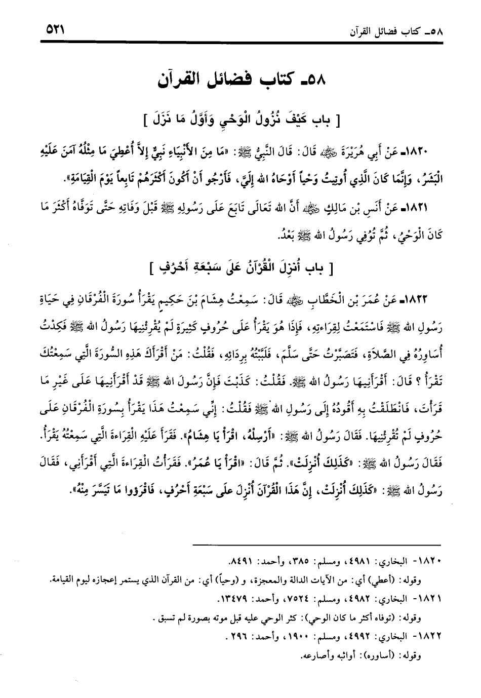 1822 - عَنْ عُمَرَ بْنِ الْخَطَّابِ - رضي الله عنه - قَالَ: سَمِعْتُ هِشَامَ بْنَ حَكِيمِ بْنِ حِزَامٍ يَقْرَأُ سُورَةَ الْفُرْقَانِ فِي حَيَاةِ رَسُولِ اللَّهِ - صلى الله عليه وسلم -، فَاسْتَمَعْتُ لِقِرَاءَتِهِ فَإِذَا هُوَ يَقْرَأُ عَلَى حُرُوفٍ كَثِيرَةٍ لَمْ يُقْرِئْنِيهَا رَسُولُ اللَّهِ - صلى الله عليه وسلم -، فَكِدْتُ أُسَاوِرُهُ فِي الصَّلاةِ، فَتَصَبَّرْتُ حَتَّى سَلَّمَ فَلَبَّبْتُهُ بِرِدَائِهِ فَقُلْتُ: مَنْ أَقْرَأَكَ هَذِهِ السُّورَةَ الَّتِي سَمِعْتُكَ تَقْرَأُ؟ قَالَ: أَقْرَأَنِيهَا رَسُولُ اللَّهِ - صلى الله عليه وسلم -، فَقُلْتُ: كَذَبْتَ فَإِنَّ رَسُولَ اللَّهِ - صلى الله عليه وسلم - قَدْ أَقْرَأَنِيهَا عَلَى غَيْرِ مَا قَرَأْتَ، فَانْطَلَقْتُ بِهِ أَقُودُهُ إِلَى رَسُولِ اللَّهِ - صلى الله عليه وسلم -، فَقُلْتُ: إِنِّي سَمِعْتُ هَذَا يَقْرَأُ بِسُورَةِ الْفُرْقَانِ عَلَى حُرُوفٍ لَمْ تُقْرِئْنِيهَا، فَقَالَ رَسُولُ اللَّهِ - صلى الله عليه وسلم -: «أَرْسِلْهُ، اقْرَأْ يَا هِشَامُ». فَقَرَأَ عَلَيْهِ الْقِرَاءَةَ الَّتِي سَمِعْتُهُ يَقْرَأُ. فَقَالَ رَسُولُ اللَّهِ - صلى الله عليه وسلم -: «كَذَلِكَ أُنْزِلَتْ». ثُمَّ قَالَ: «اقْرَأْ يَا عُمَرُ». فَقَرَأْتُ الْقِرَاءَةَ الَّتِي أَقْرَأَنِي. فَقَالَ رَسُولُ اللَّهِ - صلى الله عليه وسلم -: «كَذَلِكَ أُنْزِلَتْ، إِنَّ هَذَا الْقُرْآنَ أُنْزِلَ عَلَى سَبْعَةِ أَحْرُفٍ، فَاقْرَءُوا مَا تَيَسَّرَ مِنْهُ». (بخاري: 4992)