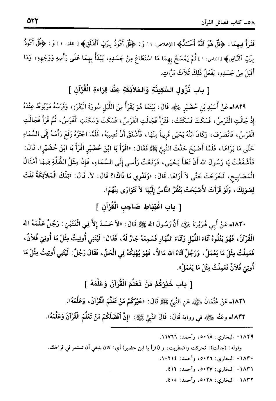 1829 - عَنْ أُسَيْدِ بْنِ حُضَيْرٍ - رضي الله عنه - قَالَ: بَيْنَمَا هُوَ يَقْرَأُ مِنَ اللَّيْلِ سُورَةَ الْبَقَرَةِ وَفَرَسُهُ مَرْبُوطَةٌ عِنْدَهُ إِذْ جَالَتِ الْفَرَسُ، فَسَكَتَ فَسَكَتَتْ، فَقَرَأَ فَجَالَتِ الْفَرَسُ، فَسَكَتَ وَسَكَتَتِ الْفَرَسُ، ثُمَّ قَرَأَ فَجَالَتِ الْفَرَسُ، فَانْصَرَفَ، وَكَانَ ابْنُهُ يَحْيَى قَرِيبًا مِنْهَا فَأَشْفَقَ أَنْ تُصِيبَهُ، فَلَمَّا اجْتَرَّهُ رَفَعَ رَأْسَهُ إِلَى السَّمَاءِ حَتَّى مَا يَرَاهَا، فَلَمَّا أَصْبَحَ حَدَّثَ النَّبِيَّ - صلى الله عليه وسلم -، فَقَالَ: «اقْرَأْ يَا ابْنَ حُضَيْرٍ، اقْرَأْ يَا ابْنَ حُضَيْرٍ». قَالَ: فَأَشْفَقْتُ يَا رَسُولَ اللَّهِ أَنْ تَطَأَ يَحْيَى وَكَانَ مِنْهَا قَرِيبًا، فَرَفَعْتُ رَأْسِي فَانْصَرَفْتُ إِلَيْهِ، فَرَفَعْتُ رَأْسِي إِلَى السَّمَاءِ، فَإِذَا مِثْلُ الظُّلَّةِ فِيهَا أَمْثَالُ الْمَصَابِيحِ، فَخَرَجَتُ حَتَّى لا أَرَاهَا، قَالَ: «وَتَدْرِي مَا ذَاكَ»؟ قَالَ: لا، قَالَ: «تِلْكَ الْمَلائِكَةُ دَنَتْ لِصَوْتِكَ، وَلَوْ قَرَأْتَ لأَصْبَحَتْ يَنْظُرُ النَّاسُ إِلَيْهَا لا تَتَوَارَى مِنْهُمْ». (بخاري: 5018)