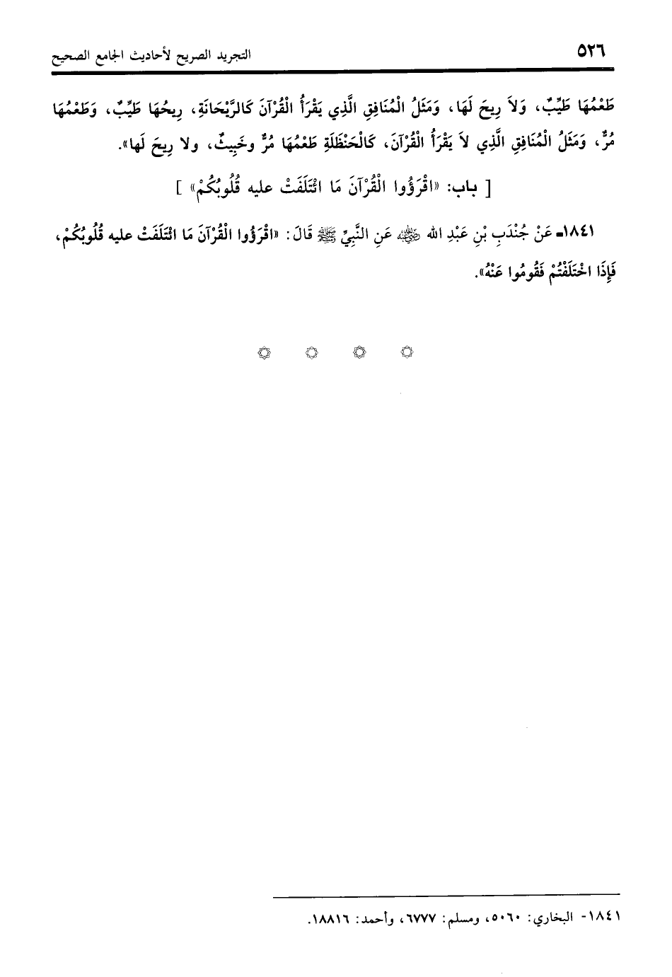 1841 - عَنْ جُنْدَبِ بْنِ عَبْدِ اللَّهِ - رضي الله عنه - عَنِ النَّبِيِّ - صلى الله عليه وسلم - قَالَ: «اقْرَءُوا الْقُرْآنَ مَا ائْتَلَفَتْ قُلُوبُكُمْ، فَإِذَا اخْتَلَفْتُمْ فَقُومُوا عَنْهُ». (بخاري: 5060)