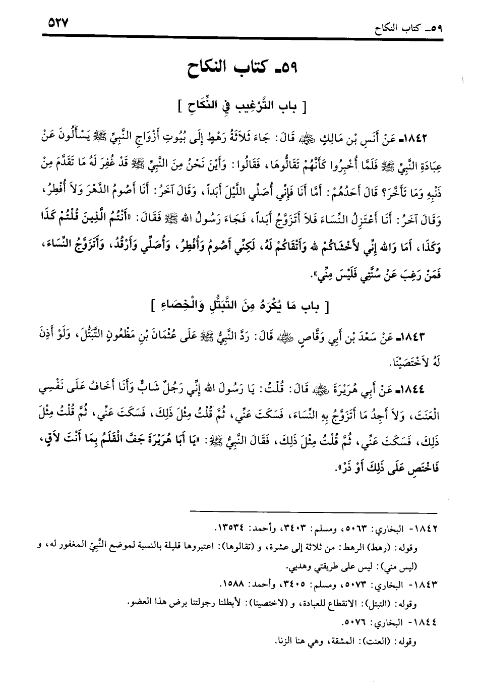 1842 - عَنْ أَنَسِ بْنِ مَالِكٍ - رضي الله عنه - قَالَ: جَاءَ ثَلاثَةُ رَهْطٍ إِلَى بُيُوتِ أَزْوَاجِ النَّبِيِّ - صلى الله عليه وسلم - يَسْأَلُونَ عَنْ عِبَادَةِ النَّبِيِّ - صلى الله عليه وسلم -، فَلَمَّا أُخْبِرُوا كَأَنَّهُمْ تَقَالُّوهَا، فَقَالُوا: وَأَيْنَ نَحْنُ مِنَ النَّبِيِّ - صلى الله عليه وسلم -؟ قَدْ غُفِرَ لَهُ مَا تَقَدَّمَ مِنْ ذَنْبِهِ وَمَا تَأَخَّرَ، قَالَ أَحَدُهُمْ: أَمَّا أَنَا فَإِنِّي أُصَلِّي اللَّيْلَ أَبَدًا، وَقَالَ آخَرُ: أَنَا أَصُومُ الدَّهْرَ وَلا أُفْطِرُ، وَقَالَ آخَرُ: أَنَا أَعْتَزِلُ النِّسَاءَ فَلا أَتَزَوَّجُ أَبَدًا. فَجَاءَ رَسُولُ اللَّهِ - صلى الله عليه وسلم - إِلَيْهِمْ فَقَالَ: «أَنْتُمُ الَّذِينَ قُلْتُمْ كَذَا وَكَذَا؟ أَمَا وَاللَّهِ إِنِّي لأَخْشَاكُمْ لِلَّهِ وَأَتْقَاكُمْ لَهُ، لَكِنِّي أَصُومُ وَأُفْطِرُ، وَأُصَلِّي وَأَرْقُدُ، وَأَتَزَوَّجُ النِّسَاءَ، فَمَنْ رَغِبَ عَنْ سُنَّتِي فَلَيْسَ مِنِّي». (بخاري: 5063)