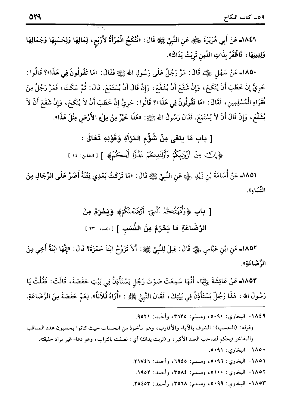 1849 - عَنْ أَبِي هُرَيْرَةَ - رضي الله عنه - عَنِ النَّبِيِّ - صلى الله عليه وسلم - قَالَ: «تُنْكَحُ الْمَرْأَةُ لأَرْبَعٍ: لِمَالِهَا وَلِحَسَبِهَا وَجَمَالِهَا وَلِدِينِهَا، فَاظْفَرْ بِذَاتِ الدِّينِ تَرِبَتْ يَدَاكَ». (بخاري: 5090)