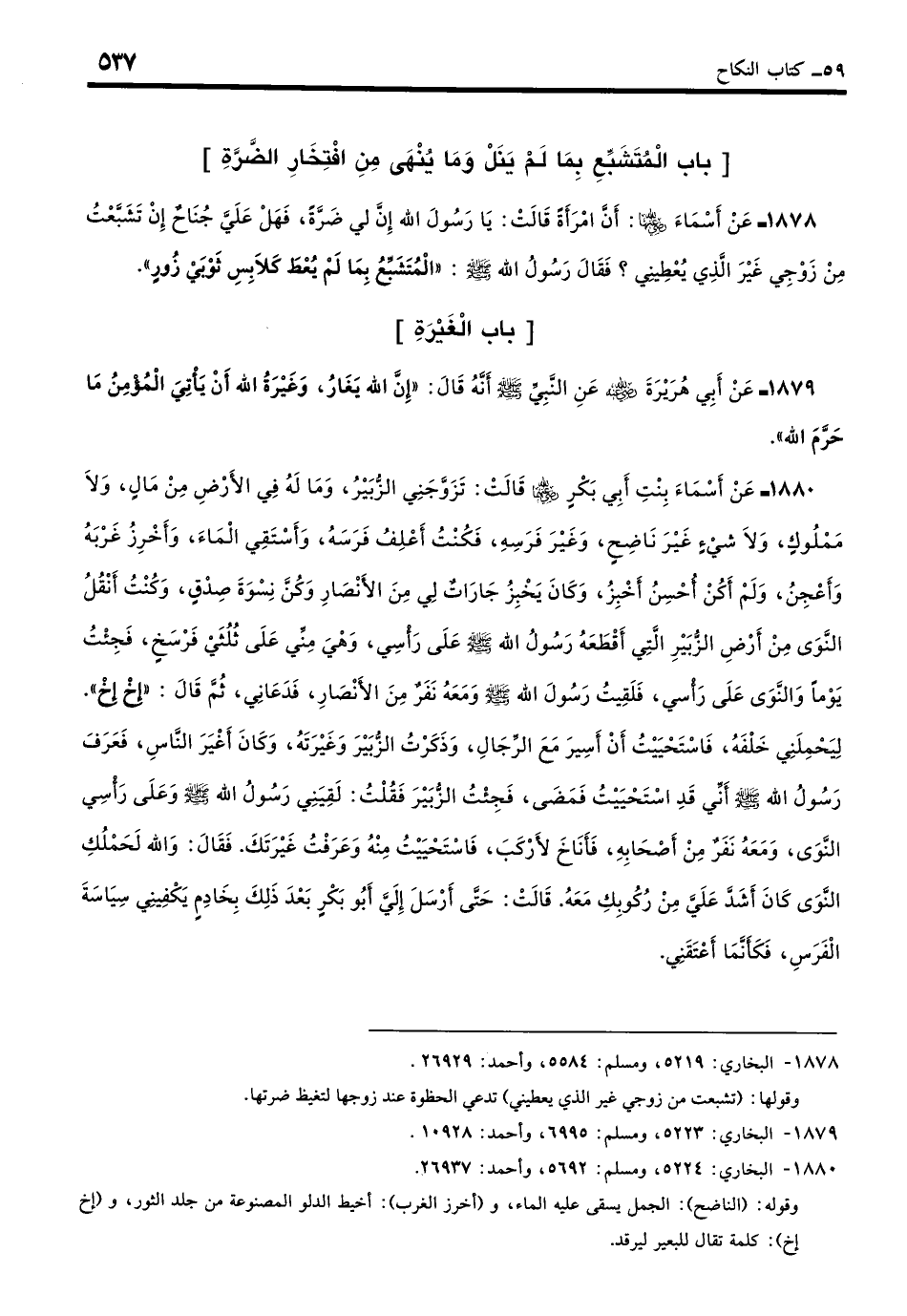 1878 - عَنْ أَسْمَاءَ - رضي الله عنها -: أَنَّ امْرَأَةً قَالَتْ: يَا رَسُولَ اللَّهِ، إِنَّ لِي ضَرَّةً، فَهَلْ عَلَيَّ جُنَاحٌ إِنْ تَشَبَّعْتُ مِنْ زَوْجِي غَيْرَ الَّذِي يُعْطِينِي؟ فَقَالَ رَسُولُ اللَّهِ - صلى الله عليه وسلم -: «الْمُتَشَبِّعُ بِمَا لَمْ يُعْطَ كَلابِسِ ثَوْبَيْ زُورٍ». (بخاري: 5219)