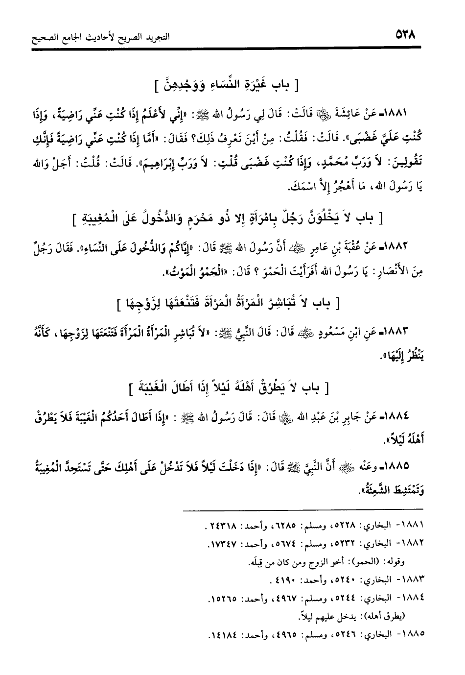 1882 - عَنْ عُقْبَةَ بْنِ عَامِرٍ - رضي الله عنه -: أَنَّ رَسُولَ اللَّهِ - صلى الله عليه وسلم - قَالَ: «إِيَّاكُمْ وَالدُّخُولَ عَلَى النِّسَاءِ». فَقَالَ رَجُلٌ مِنَ الأَنْصَارِ: يَا رَسُولَ اللَّهِ، أَفَرَأَيْتَ الْحَمْوَ؟ قَالَ: «الْحَمْوُ الْمَوْتُ». (بخاري: 5232)