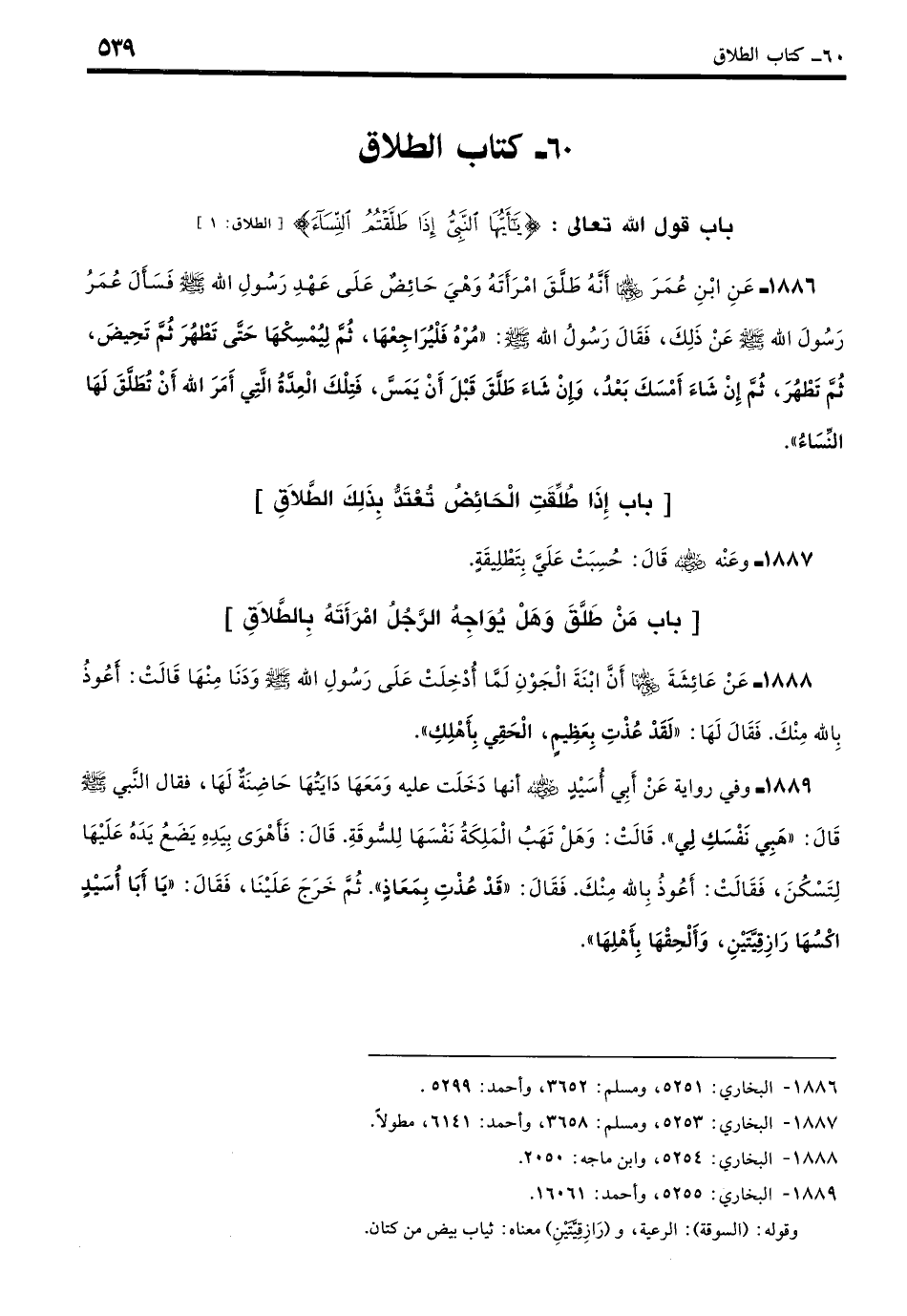 1886 - عَنْ عَبْدِ اللَّهِ بْنِ عُمَرَ - رضي الله عنهما -: أَنَّهُ طَلَّقَ امْرَأَتَهُ وَهِيَ حَائِضٌ عَلَى عَهْدِ رَسُولِ اللَّهِ - صلى الله عليه وسلم -، فَسَأَلَ عُمَرُ بْنُ الْخَطَّابِ رَسُولَ اللَّهِ - صلى الله عليه وسلم - عَنْ ذَلِكَ، فَقَالَ رَسُولُ اللَّهِ - صلى الله عليه وسلم -: «مُرْهُ فَلْيُرَاجِعْهَا، ثُمَّ لِيُمْسِكْهَا حَتَّى تَطْهُرَ ثُمَّ تَحِيضَ ثُمَّ تَطْهُرَ، ثُمَّ إِنْ شَاءَ أَمْسَكَ بَعْدُ وَإِنْ شَاءَ طَلَّقَ قَبْلَ أَنْ يَمَسَّ، فَتِلْكَ الْعِدَّةُ الَّتِي أَمَرَ اللَّهُ أَنْ تُطَلَّقَ لَهَا النِّسَاءُ». (بخاري: 5252)