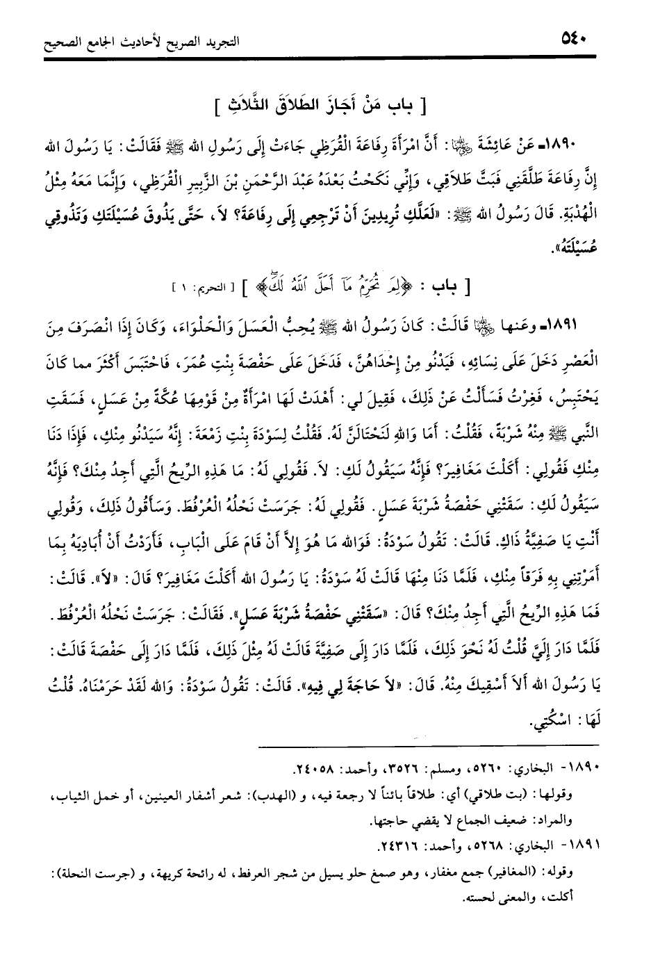 1890 - عَنْ عَائِشَةَ - رضي الله عنها -: أَنَّ امْرَأَةَ رِفَاعَةَ الْقُرَظِيِّ جَاءَتْ إِلَى رَسُولِ اللَّهِ - صلى الله عليه وسلم - فَقَالَتْ: يَا رَسُولَ اللَّهِ، إِنَّ رِفَاعَةَ طَلَّقَنِي فَبَتَّ طَلاقِي، وَإِنِّي نَكَحْتُ بَعْدَهُ عَبْدَ الرَّحْمَنِ بْنَ الزُّبَيْرِ الْقُرَظِيَّ، وَإِنَّمَا مَعَهُ مِثْلُ الْهُدْبَةِ. قَالَ رَسُولُ اللَّهِ - صلى الله عليه وسلم -: «لَعَلَّكِ تُرِيدِينَ أَنْ تَرْجِعِي إِلَى رِفَاعَةَ؟ لَا حَتَّى يَذُوقَ عُسَيْلَتَكِ وَتَذُوقِي عُسَيْلَتَهُ». (بخاري: 5260)