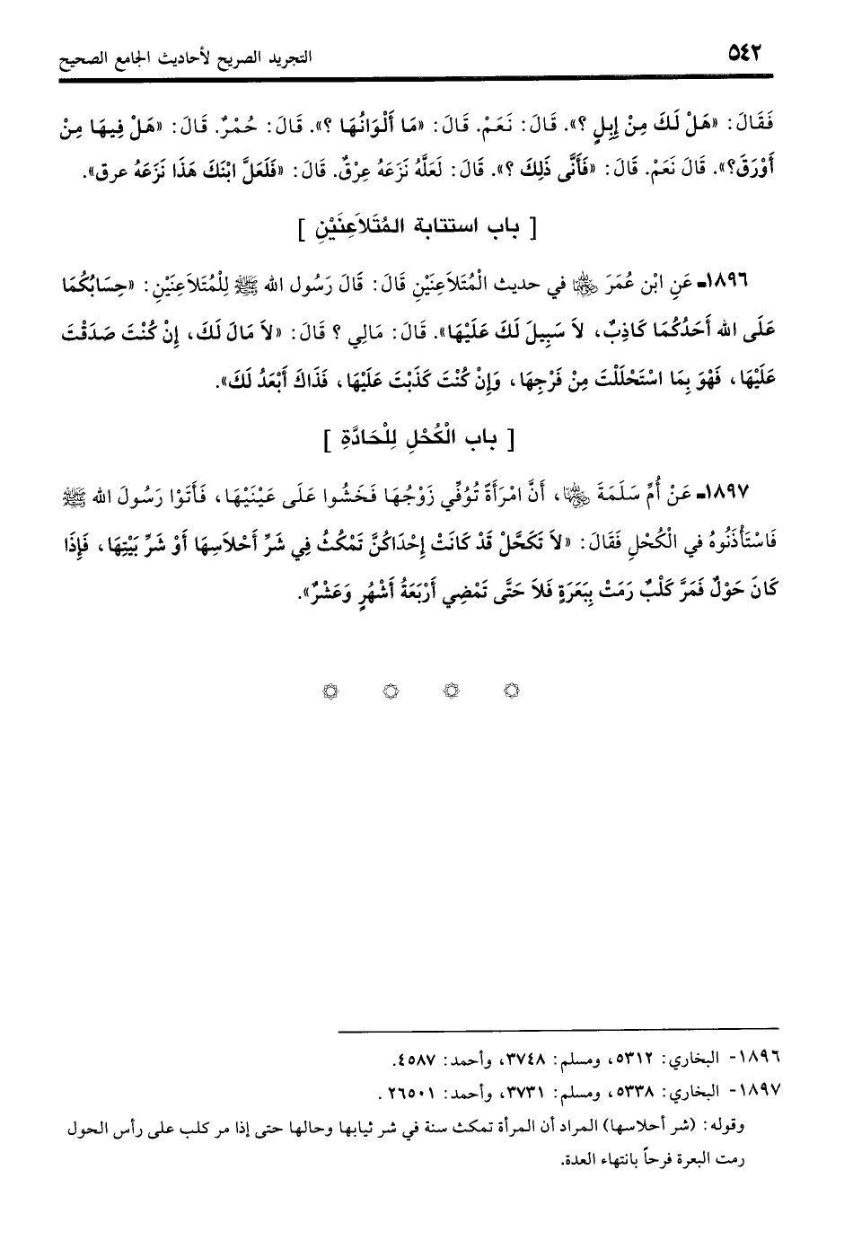 1897 - عَنْ أُمِّ سَلَمَةَ - رضي الله عنها -: أَنَّ امْرَأَةً تُوُفِّيَ زَوْجُهَا فَخَشُوا عَلَى عَيْنَيْهَا، فَأَتَوْا رَسُولَ اللَّهِ - صلى الله عليه وسلم -، فَاسْتَأْذَنُوهُ فِي الْكُحْلِ. فَقَالَ: «لا تَكَحَّلْ، قَدْ كَانَتْ إِحْدَاكُنَّ تَمْكُثُ فِي شَرِّ أَحْلاسِهَا، أَوْ شَرِّ بَيْتِهَا، فَإِذَا كَانَ حَوْلٌ، فَمَرَّ كَلْبٌ رَمَتْ بِبَعَرَةٍ، فَلَا حَتَّى تَمْضِيَ أَرْبَعَةُ أَشْهُرٍ وَعَشْرٌ». (بخاري: 5339)