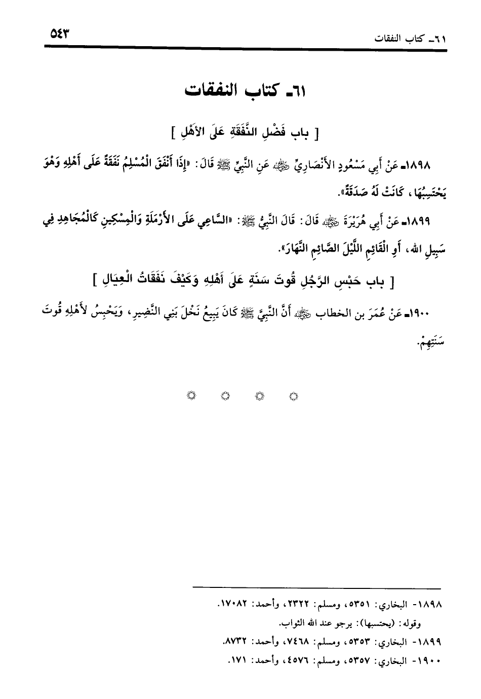1898 - عَنْ أَبِي مَسْعُودٍ الأَنْصَارِيِّ - رضي الله عنه - عَنِ النَّبِيِّ - صلى الله عليه وسلم - قَالَ: «إِذَا أَنْفَقَ الْمُسْلِمُ نَفَقَةً عَلَى أَهْلِهِ وَهُوَ يَحْتَسِبُهَا كَانَتْ لَهُ صَدَقَةً». (بخاري: 5351)