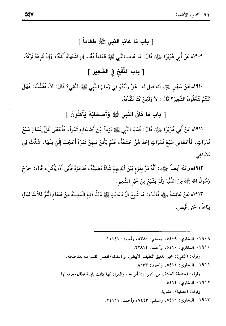 1910 - عَنْ سَهْلٍ - رضي الله عنه -: أَنَّهُ قِيْلَ لَهُ: هَلْ رَأَيْتُمْ فِي زَمَانِ النَّبِيِّ - صلى الله عليه وسلم - النَّقِيَّ؟ قَالَ: لَا، فَقِيْلَ: فَهَلْ كُنْتُمْ تَنْخُلُونَ الشَّعِيرَ؟ قَالَ: لَا، وَلَكِنْ كُنَّا نَنْفُخُهُ. (بخاري: 5410)