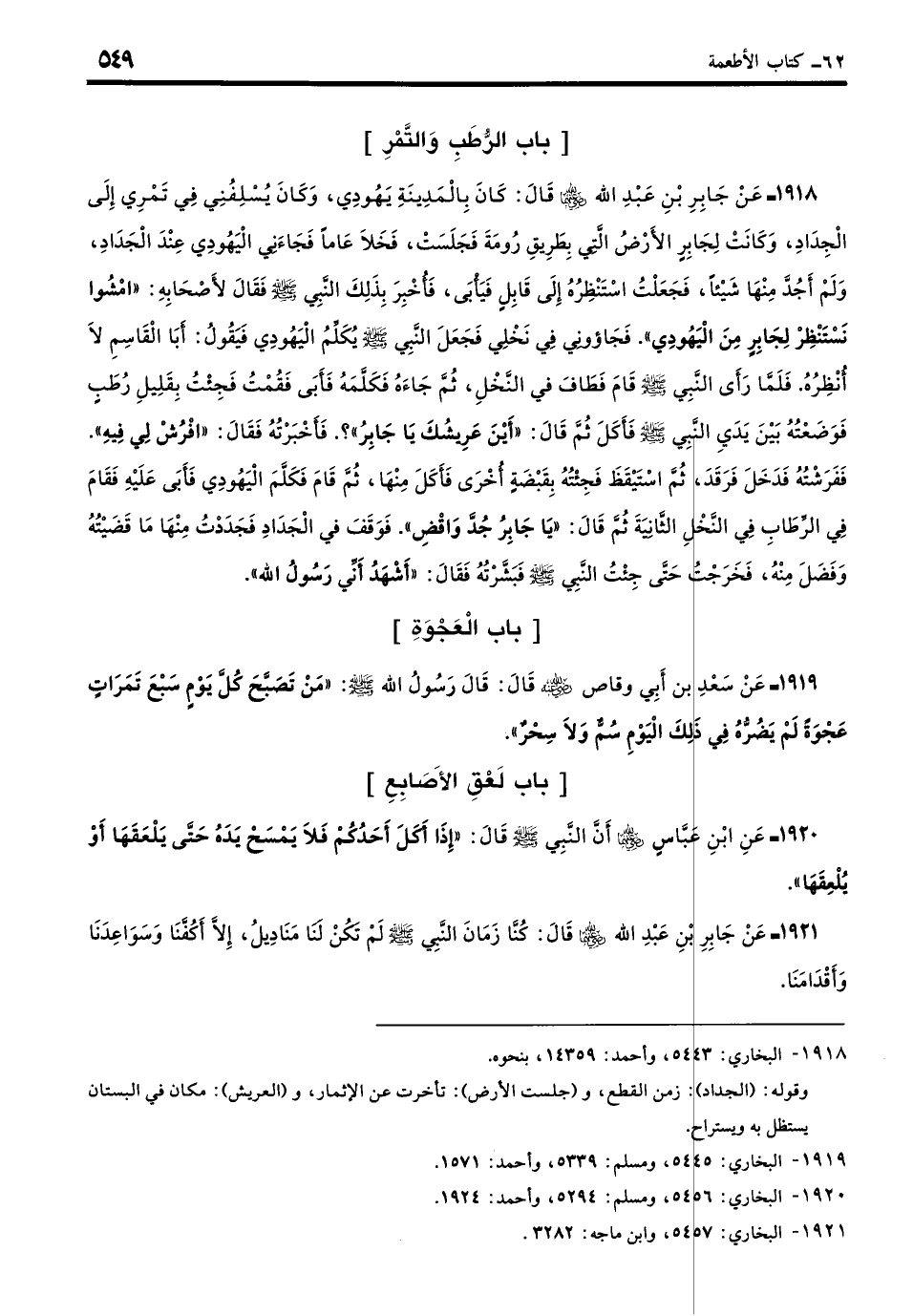 1918 - عَنْ جَابِرِ بْنِ عَبْدِ اللَّهِ - رضي الله عنهما -، قَالَ: كَانَ بِالْمَدِينَةِ يَهُودِيٌّ، وَكَانَ يُسْلِفُنِي فِي تَمْرِي إِلَى الْجِدَادِ، وَكَانَتْ لِجَابِرٍ الأَرْضُ الَّتِي بِطَرِيقِ رُومَةَ. فَجَلَسَتْ، فَخَلا عَامًا، فَجَاءَنِي الْيَهُودِيُّ عِنْدَ الْجَدَادِ، وَلَمْ أَجُدَّ مِنْهَا شَيْئًا. فَجَعَلْتُ أَسْتَنْظِرُهُ إِلَى قَابِلٍ فَيَأْبَى، فَأُخْبِرَ بِذَلِكَ النَّبِيُّ - صلى الله عليه وسلم -، فَقَالَ لأَصْحَابِهِ: «امْشُوا نَسْتَنْظِرْ لِجَابِرٍ مِنَ الْيَهُودِيِّ». فَجَاءُونِي فِي نَخْلِي، فَجَعَلَ النَّبِيُّ - صلى الله عليه وسلم - يُكَلِّمُ الْيَهُودِيَّ. فَيَقُولُ: أَبَا الْقَاسِمِ! لا أُنْظِرُهُ، فَلَمَّا رَأَى النَّبِيُّ - صلى الله عليه وسلم - قَامَ فَطَافَ فِي النَّخْلِ، ثُمَّ جَاءَهُ فَكَلَّمَهُ، فَأَبَى. فَقُمْتُ فَجِئْتُ بِقَلِيلِ رُطَبٍ فَوَضَعْتُهُ بَيْنَ يَدَيِ النَّبِيِّ - صلى الله عليه وسلم - فَأَكَلَ. ثُمَّ قَالَ: «أَيْنَ عَرِيشُكَ يَا جَابِرُ»؟ فَأَخْبَرْتُهُ. فَقَالَ: «افْرُشْ لِي فِيهِ». فَفَرَشْتُهُ، فَدَخَلَ فَرَقَدَ ثُمَّ اسْتَيْقَظَ، فَجِئْتُهُ بِقَبْضَةٍ أُخْرَى، فَأَكَلَ مِنْهَا. ثُمَّ قَامَ فَكَلَّمَ الْيَهُودِيَّ فَأَبَى عَلَيْهِ. فَقَامَ فِي الرِّطَابِ فِي النَّخْلِ الثَّانِيَةَ. ثُمَّ قَالَ: «يَا جَابِرُ! جُدَّ وَاقْضِ». فَوَقَفَ فِي الْجَدَادِ، فَجَدَدْتُ مِنْهَا مَا قَضَيْتُهُ، وَفَضَلَ مِنْهُ. فَخَرَجْتُ حَتَّى جِئْتُ النَّبِيَّ - صلى الله عليه وسلم - فَبَشَّرْتُهُ، فَقَالَ: «أَشْهَدُ أَنِّي رَسُولُ اللَّهِ». (بخاري: 5443)