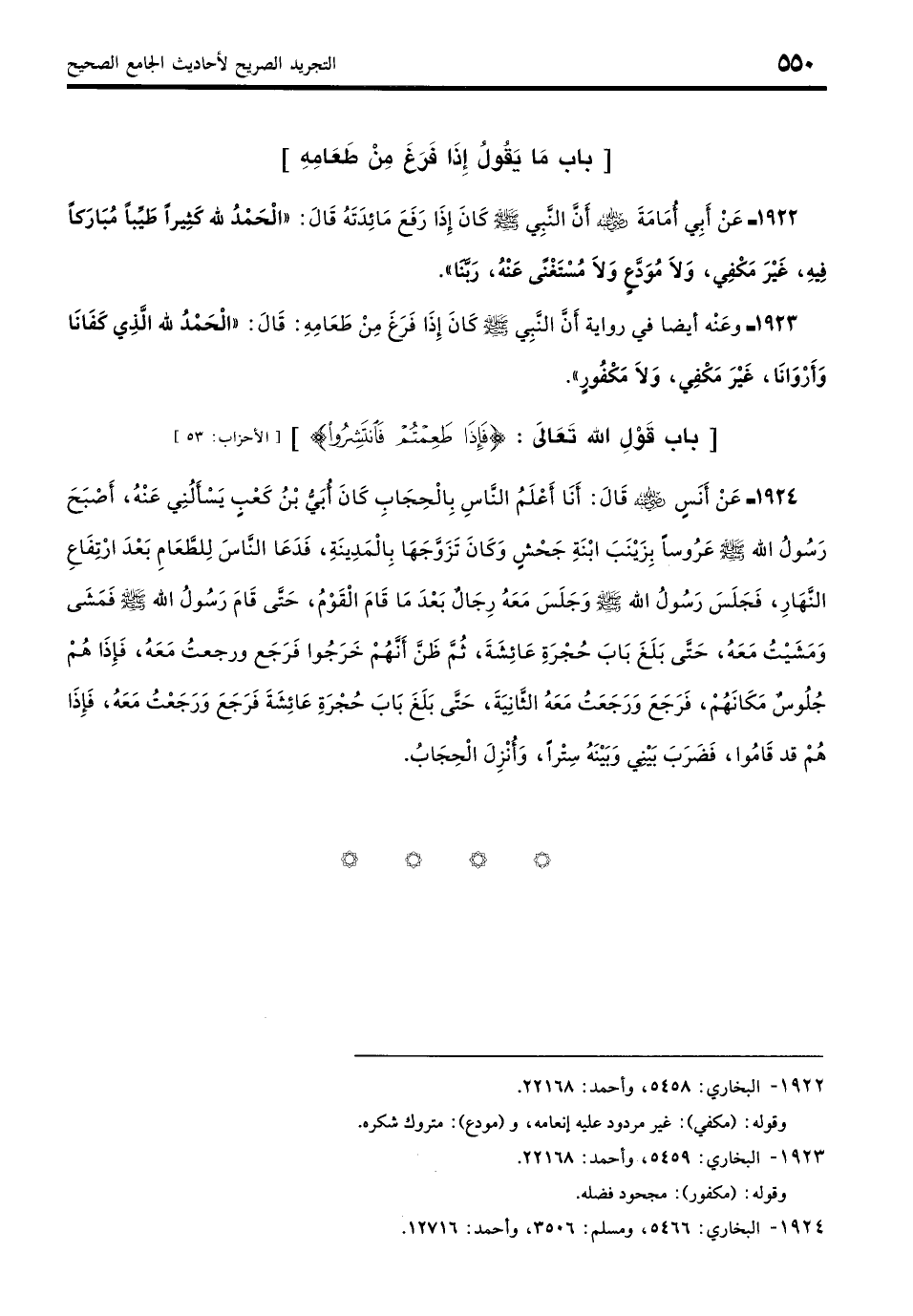 1924 - عَنْ أَنَسٍ - رضي الله عنه - قَالَ: أَنَا أَعْلَمُ النَّاسِ بِالْحِجَابِ، كَانَ أُبَيُّ بْنُ كَعْبٍ يَسْأَلُنِي عَنْهُ، أَصْبَحَ رَسُولُ اللَّهِ - صلى الله عليه وسلم - عَرُوسًا بِزَيْنَبَ بِنْتِ جَحْشٍ، وَكَانَ تَزَوَّجَهَا بِالْمَدِينَةِ، فَدَعَا النَّاسَ لِلطَّعَامِ بَعْدَ ارْتِفَاعِ النَّهَارِ، فَجَلَسَ رَسُولُ اللَّهِ - صلى الله عليه وسلم - وَجَلَسَ مَعَهُ رِجَالٌ بَعْدَ مَا قَامَ الْقَوْمُ حَتَّى قَامَ رَسُولُ اللَّهِ - صلى الله عليه وسلم -، فَمَشَى وَمَشَيْتُ مَعَهُ حَتَّى بَلَغَ بَابَ حُجْرَةِ عَائِشَةَ، ثُمَّ ظَنَّ أَنَّهُمْ خَرَجُوا، فَرَجَعْتُ مَعَهُ، فَإِذَا هُمْ جُلُوسٌ مَكَانَهُمْ، فَرَجَعَ وَرَجَعْتُ مَعَهُ الثَّانِيَةَ حَتَّى بَلَغَ بَابَ حُجْرَةِ عَائِشَةَ، فَرَجَعَ وَرَجَعْتُ مَعَهُ، فَإِذَا هُمْ قَدْ قَامُوا، فَضَرَبَ بَيْنِي وَبَيْنَهُ سِتْرًا وَأُنْزِلَ الْحِجَابُ. (بخاري: 5466)