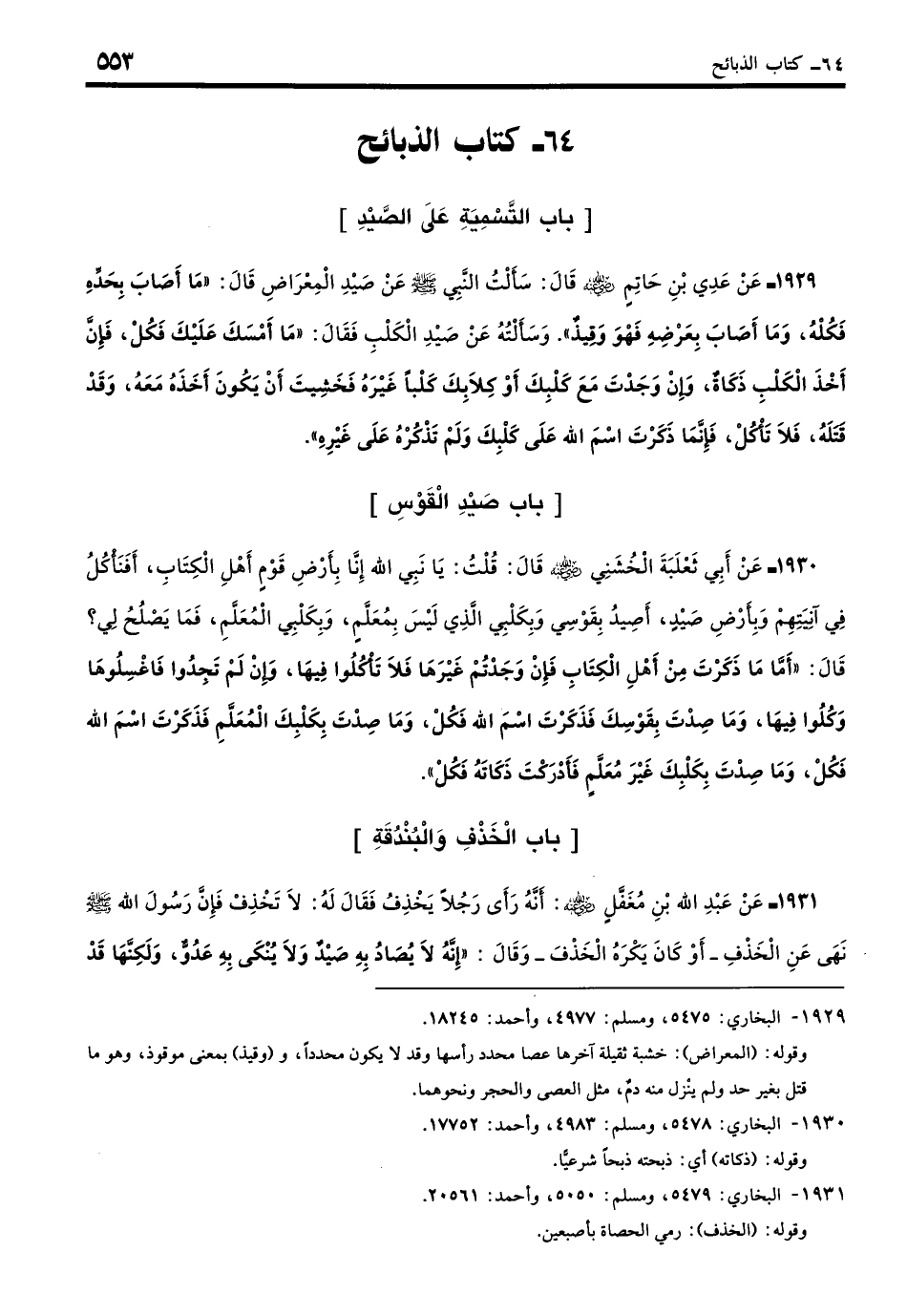 1929 - عَنْ عَدِيِّ بْنِ حَاتِمٍ - رضي الله عنه - قَالَ: سَأَلْتُ النَّبِيَّ - صلى الله عليه وسلم - عَنْ صَيْدِ الْمِعْرَاضِ، قَالَ: «مَا أَصَابَ بِحَدِّهِ فَكُلْهُ، وَمَا أَصَابَ بِعَرْضِهِ فَهُوَ وَقِيذٌ». وَسَأَلْتُهُ عَنْ صَيْدِ الْكَلْبِ، فَقَالَ: «مَا أَمْسَكَ عَلَيْكَ فَكُلْ، فَإِنَّ أَخْذَ الْكَلْبِ ذَكَاةٌ، وَإِنْ وَجَدْتَ مَعَ كَلْبِكَ أَوْ كِلابِكَ كَلْبًا غَيْرَهُ فَخَشِيتَ أَنْ يَكُونَ أَخَذَهُ مَعَهُ وَقَدْ قَتَلَهُ فَلا تَأْكُلْ، فَإِنَّمَا ذَكَرْتَ اسْمَ اللَّهِ عَلَى كَلْبِكَ وَلَمْ تَذْكُرْهُ عَلَى غَيْرِهِ». (بخاري: 5475)