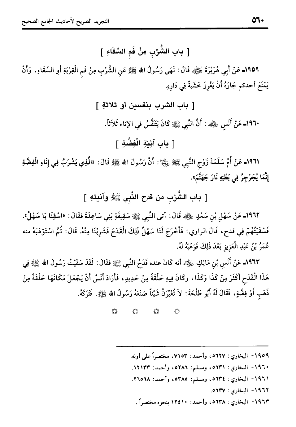 1963 - عَنْ أَنَسِ بْنِ مَالِكٍ - رضي الله عنه -: أَنَّهُ كَانَ عِنْدَهُ قَدَحَ النَّبِيِّ - صلى الله عليه وسلم -. فَقَالَ أَنَسٌ - رضي الله عنه -: لَقَدْ سَقَيْتُ رَسُولَ اللَّهِ - صلى الله عليه وسلم - فِي هَذَا الْقَدَحِ أَكْثَرَ مِنْ كَذَا وَكَذَا، وكَانَ فِيهِ حَلْقَةٌ مِنْ حَدِيدٍ، فَأَرَادَ أَنَسٌ أَنْ يَجْعَلَ مَكَانَهَا حَلْقَةً مِنْ ذَهَبٍ أَوْ فِضَّةٍ فَقَالَ لَهُ أَبُو طَلْحَةَ - رضي الله عنه -: لا تُغَيِّرَنَّ شَيْئًا صَنَعَهُ رَسُولُ اللَّهِ - صلى الله عليه وسلم -، فَتَرَكَهُ. (بخاري: 5638)