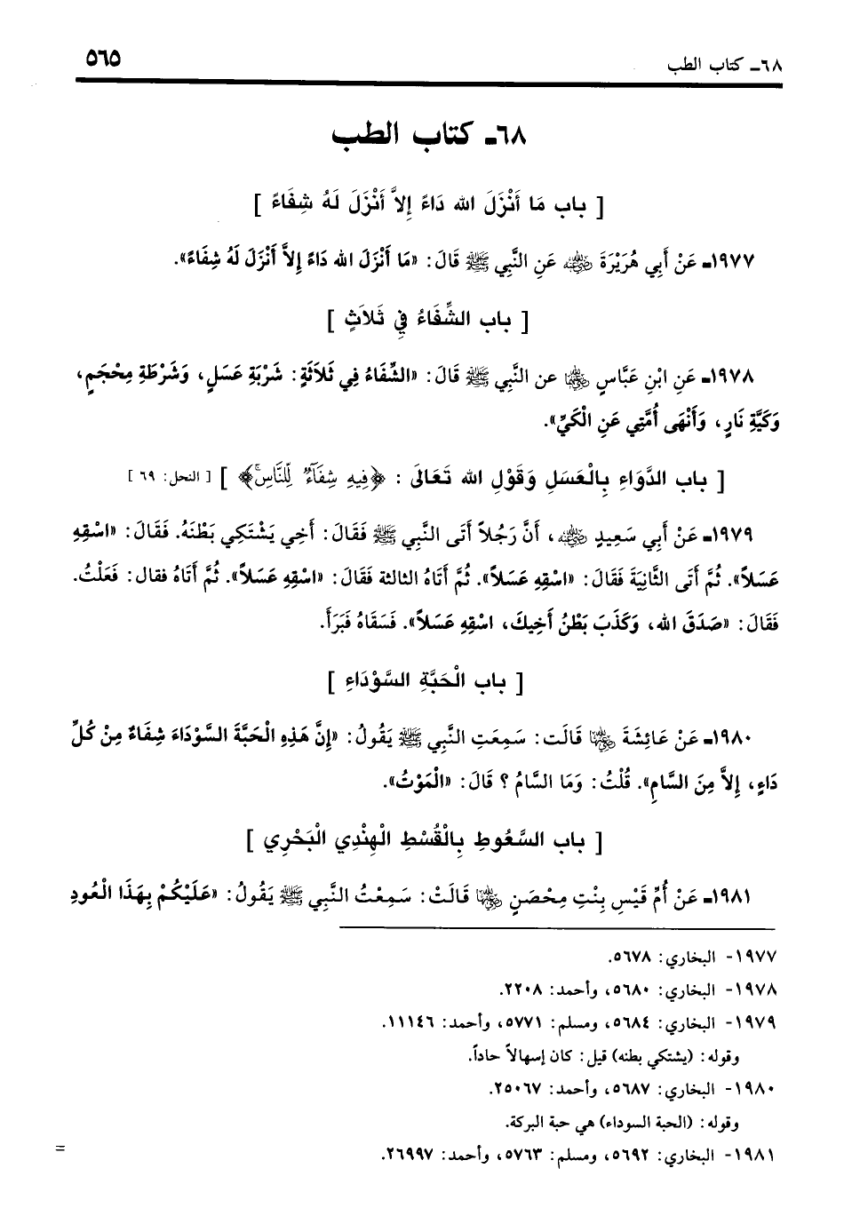 1978 - عَنِ ابْنِ عَبَّاسٍ - رضي الله عنهما - عَنِ النَّبِيِّ - صلى الله عليه وسلم - قَالَ: «الشِّفَاءُ فِي ثَلاثَةٍ: فِي شَرْطَةِ مِحْجَمٍ أَوْ شَرْبَةِ عَسَلٍ أَوْ كَيَّةٍ بِنَارٍ، وَأَنَا أَنْهَى أُمَّتِي عَنِ الْكَيِّ». (بخاري: 5681)