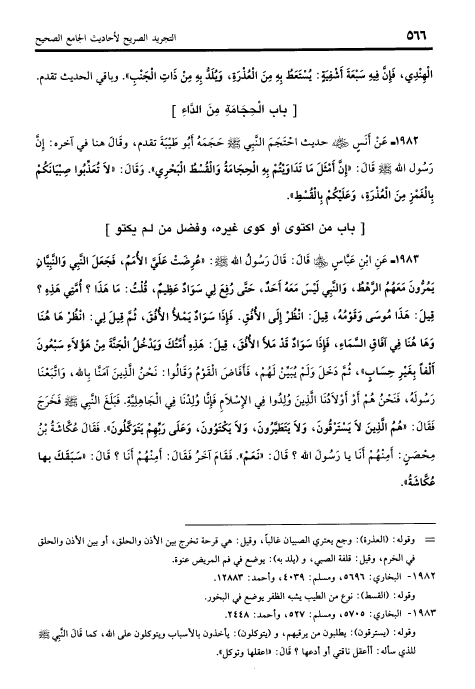 1983 - عَنِ ابْنِ عَبَّاسٍ - رضي الله عنهما - قَالَ: قَالَ رَسُولُ اللَّهِ - صلى الله عليه وسلم -: «عُرِضَتْ عَلَيَّ الأُمَمُ، فَجَعَلَ النَّبِيُّ وَالنَّبِيَّانِ يَمُرُّونَ مَعَهُمُ الرَّهْطُ، وَالنَّبِيُّ لَيْسَ مَعَهُ أَحَدٌ، حَتَّى رُفِعَ لِي سَوَادٌ عَظِيمٌ، قُلْتُ: مَا هَذَا؟ أُمَّتِي هَذِهِ؟ قِيلَ: بَلْ هَذَا مُوسَى وَقَوْمُهُ، قِيلَ: انْظُرْ إِلَى الأُفُقِ، فَإِذَا سَوَادٌ يَمْلأُ الأُفُقَ، ثُمَّ قِيلَ لِي: انْظُرْ هَاهُنَا وَهَاهُنَا فِي آفَاقِ السَّمَاءِ، فَإِذَا سَوَادٌ قَدْ مَلأَ الأُفُقَ، قِيلَ: هَذِهِ أُمَّتُكَ، وَيَدْخُلُ الْجَنَّةَ مِنْ هَؤُلاءِ سَبْعُونَ أَلْفًا بِغَيْرِ حِسَابٍ». ثُمَّ دَخَلَ وَلَمْ يُبَيِّنْ لَهُمْ، فَأَفَاضَ الْقَوْمُ وَقَالُوا: نَحْنُ الَّذِينَ آمَنَّا بِاللَّهِ وَاتَّبَعْنَا رَسُولَهُ فَنَحْنُ هُمْ، أَوْ أَوْلادُنَا الَّذِينَ وُلِدُوا فِي الإِسْلامِ فَإِنَّا وُلِدْنَا فِي الْجَاهِلِيَّةِ، فَبَلَغَ النَّبِيَّ - صلى الله عليه وسلم - فَخَرَجَ فَقَالَ: «هُمُ الَّذِينَ لا يَسْتَرْقُونَ وَلا يَتَطَيَّرُونَ وَلا يَكْتَوُونَ وَعَلَى رَبِّهِمْ يَتَوَكَّلُونَ». فَقَالَ عُكَاشَةُ بْنُ مِحْصَنٍ: أَمِنْهُمْ أَنَا يَا رَسُولَ اللَّهِ؟ قَالَ: «نَعَمْ». فَقَامَ آخَرُ فَقَالَ: أَمِنْهُمْ أَنَا؟ قَالَ: «سَبَقَكَ بِهَا عُكَاشَةُ». (بخاري: 5705)