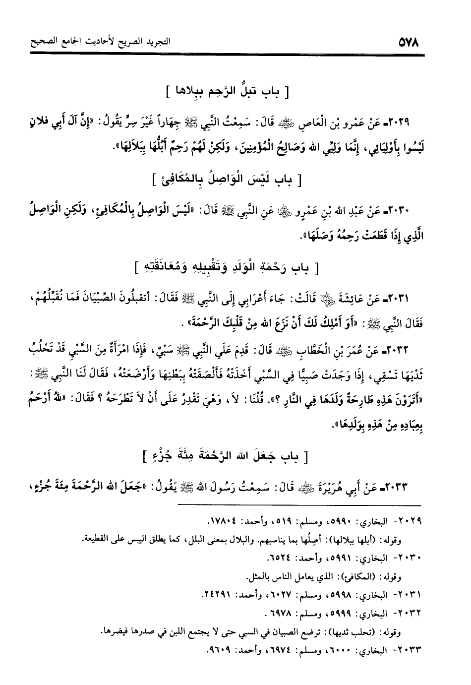 2030 - عَنْ عَبْدِ اللَّهِ بْنِ عَمْرٍو - رضي الله عنهما - عَنِ النَّبِيِّ - صلى الله عليه وسلم - قَالَ: «لَيْسَ الْوَاصِلُ بِالْمُكَافِئِ، وَلَكِنِ الْوَاصِلُ الَّذِي إِذَا قُطِعَتْ رَحِمُهُ وَصَلَهَا». (بخاري: 5991)