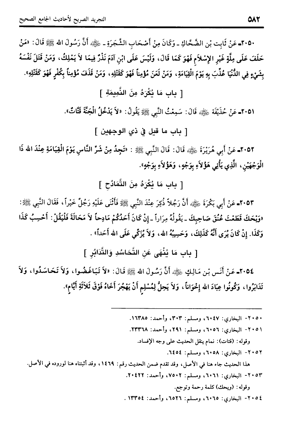 2054 - عَنْ أَنَسِ بْنِ مَالِكٍ - رضي الله عنه -: أَنَّ رَسُولَ اللَّهِ - صلى الله عليه وسلم - قَالَ: «لا تَبَاغَضُوا وَلا تَحَاسَدُوا وَلا تَدَابَرُوا، وَكُونُوا عِبَادَ اللَّهِ إِخْوَانًا، وَلا يَحِلُّ لِمُسْلِمٍ أَنْ يَهْجُرَ أَخَاهُ فَوْقَ ثَلاثَةِ أَيَّامٍ». (بخاري: 6065)