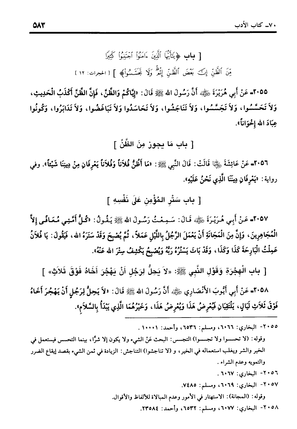 2055 - عَنْ أَبِي هُرَيْرَةَ - رضي الله عنه -: أَنَّ رَسُولَ اللَّهِ - صلى الله عليه وسلم - قَالَ: «إِيَّاكُمْ وَالظَّنَّ، فَإِنَّ الظَّنَّ أَكْذَبُ الْحَدِيثِ، وَلا تَحَسَّسُوا وَلا تَجَسَّسُوا وَلا تَنَاجَشُوا وَلا تَحَاسَدُوا وَلا تَبَاغَضُوا وَلا تَدَابَرُوا، وَكُونُوا عِبَادَ اللَّهِ إِخْوَانًا». (بخاري: 6066)
