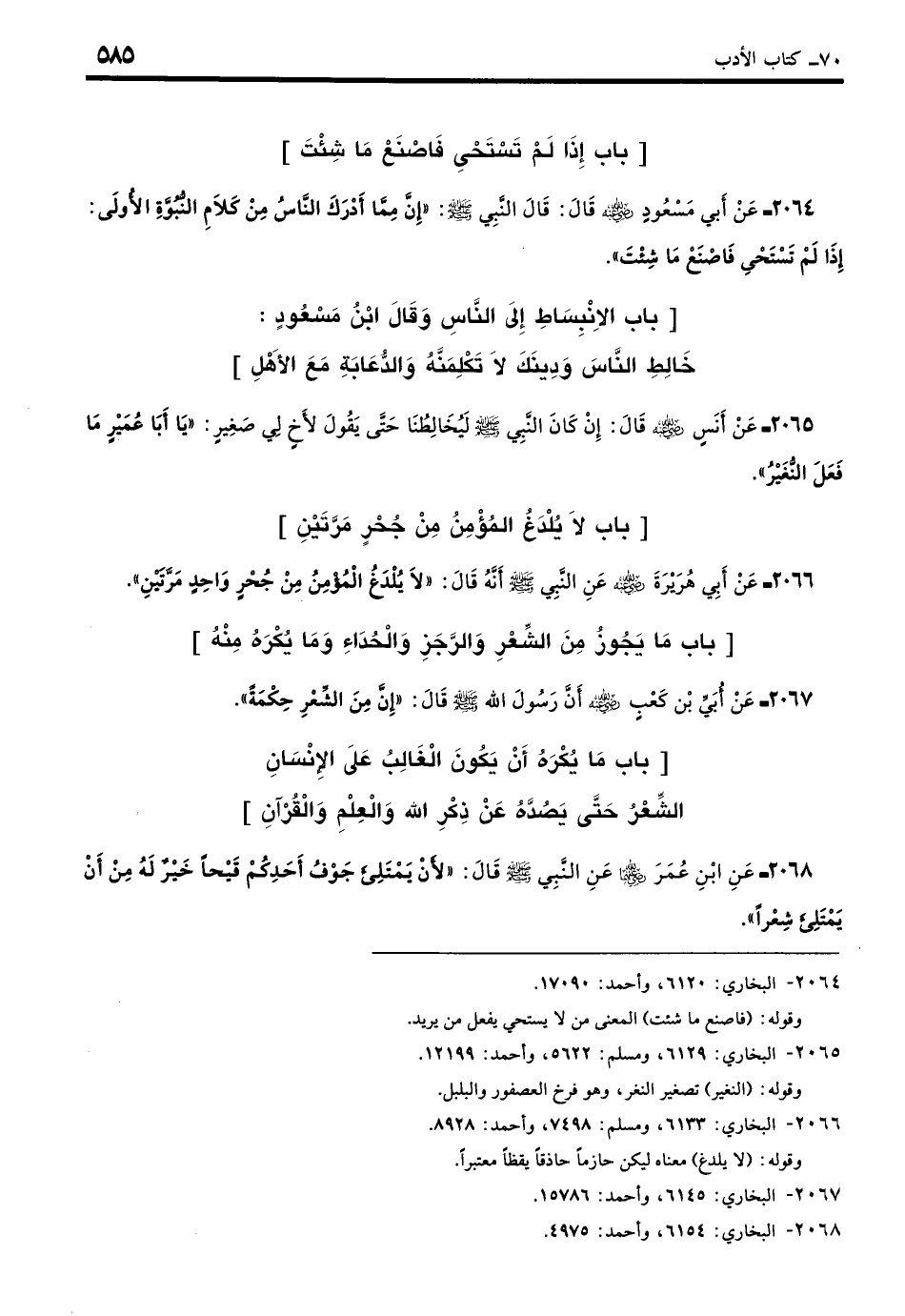 2064 - عَنْ أَبِيْ مَسْعُودٍ - رضي الله عنه - قَالَ: قَالَ النَّبِيُّ - صلى الله عليه وسلم -: «إِنَّ مِمَّا أَدْرَكَ النَّاسُ مِنْ كَلامِ النُّبُوَّةِ الأُولَى: إِذَا لَمْ تَسْتَحْيِ فَاصْنَعْ مَا شِئْتَ». (بخاري: 6120)